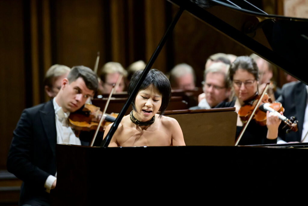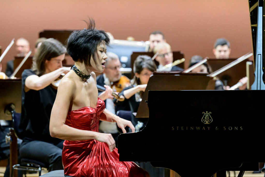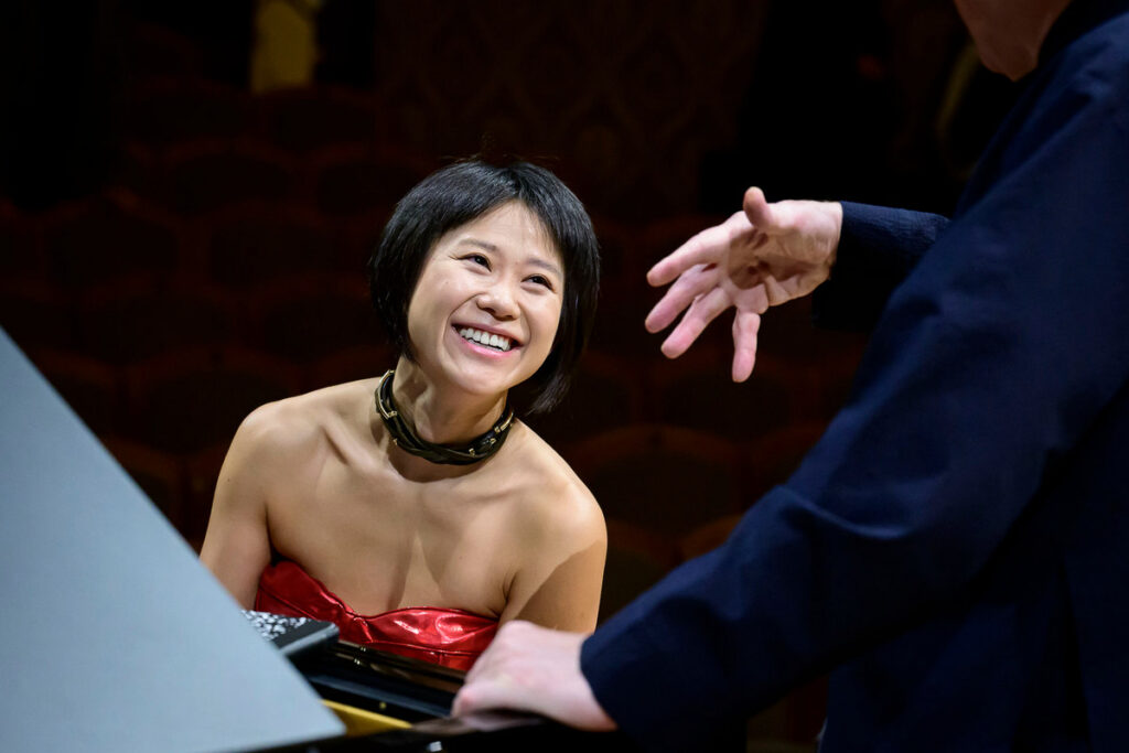 Hlavní téma první věty spustila v mírném záklonu, s větší autoritou, než jsem u ní zvyklý. Na tomto koncertě mi celkově připadala nějak zralejší – zatímco při svém nedávném pražském vystoupení v Prvním klavírním koncertu fis moll, op. 1 s efektním leskem pohazovala hlavou a její tělo se v hlasitých dynamikách škubalo, tentokrát obecně seděla pevněji, akordové pasáže v kadenci sesílala mocně a shora, důsledky použité síly jí projížděly skrz záda plynuleji a elastičtěji. V melodiích někdy možná už příliš předvídatelně oslabovala vrcholy frází (typicky třeba ve vedlejším tématu první věty), ale zároveň v nějakém obecně vkusném rámci, nepokládal bych to za manýru. Proslulou pasáž s repetovanými tóny ve druhé větě hrála tiše a ve stínu orchestru, navzdory své závratné virtuozitě na sebe neupozorňovala. Největší náboj z celé skladby pak pro mě měl přechod mezi druhou a třetí větou.