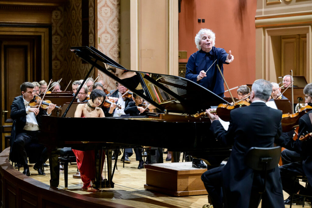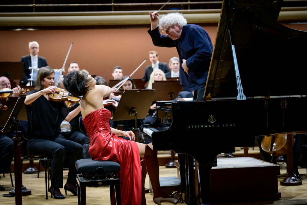 Simon Rattle s Českou filharmonií sólistku doprovázeli obdivuhodně spolehlivě, jak v ohledu souhry, tak v ohledu dynamického vývoje. V první větě mě vždy před každým znovuuvedením hlavního tématu v tónině d moll přesvědčilo tempové rozšíření a následné a tempo. Tónově se mi moc líbilo oduševnělé klarinetové sólo po kadenci, nastupující hned po sólech flétny a hoboje. Přestože hybnost skladby plynula přirozeně, strukturu celku mírně tříštily některé motivy v orchestru, které si dynamickými poryvy vyprošovaly možná víc vlastní pozornosti, než by potřebovaly. Oproti tomu některé fráze, například v orchestrálním úvodu druhé věty, se skoro ještě ani neuzavřely a záhy po nich následovala nová. Výsledkem byl dojem jedné ještě delší, nekončící fráze, která mi zněla v tomto typu hudby pravdivě, idiomaticky.