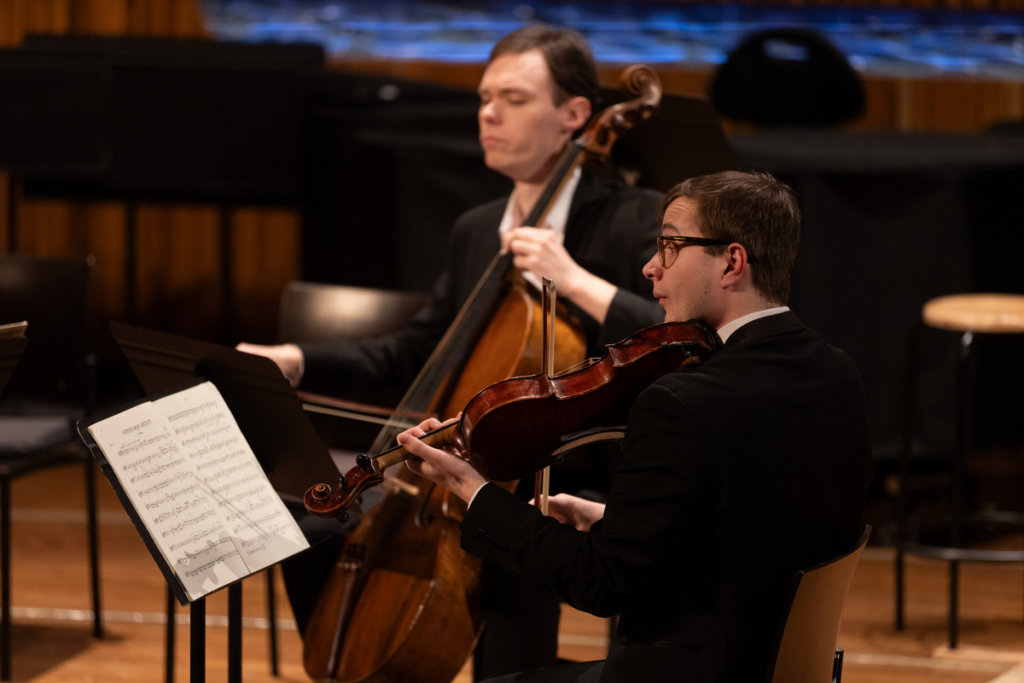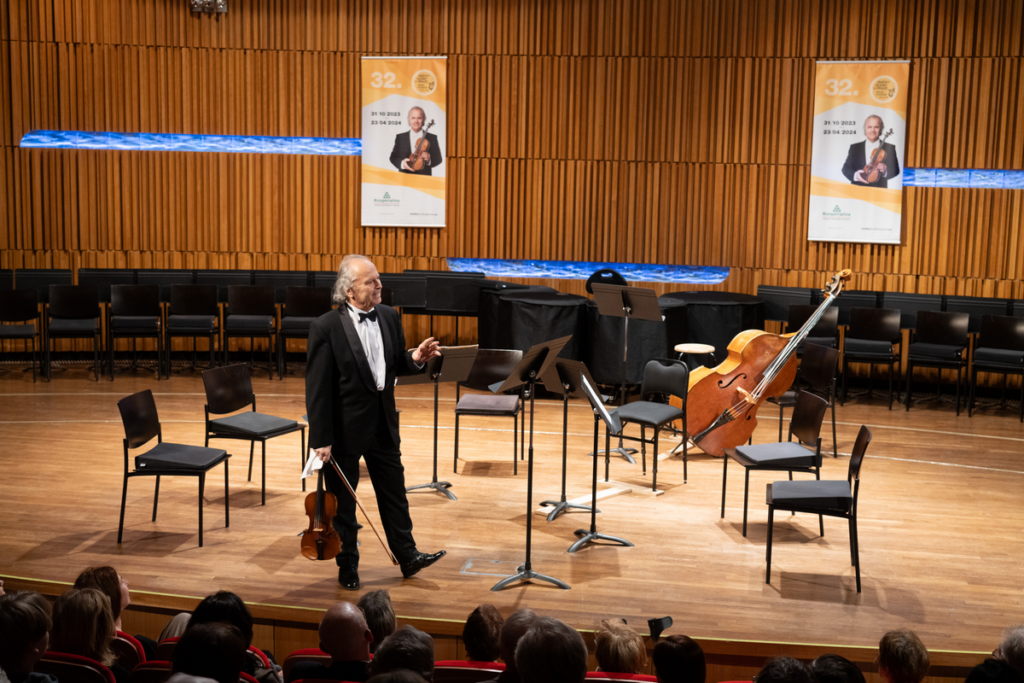 Program večera uvedl Václav Hudeček humorně laděným komentářem, kterým přiblížil dvojitý záskok v řadách účinkujících. Místo původně plánované účasti kvarteta Apollon přijalo pozvání Wihanovo kvarteto, ovšem s jistou personální úpravou. Violoncellistu tohoto souboru Michala Kaňku zastoupil Adam Klánský, který je stabilním členem souboru Ševčík Quartet od července roku 2022. Obě kvarteta se pak k provedení první skladby programu sloučila do komorního ansámblu, který doplnil Rostislav Tvrdík na kontrabas. Sólo v Koncertu pro housle, smyčcový orchestr a continuo G dur, R 310 Antonia Vivaldiho z cyklu L´estro armonico hrál Václav Hudeček. Ad hoc sestavený ansámbl splnil svou úlohu se ctí a výtečně pohyblivý kontrabas přesvědčivě „tvrdil muziku“.