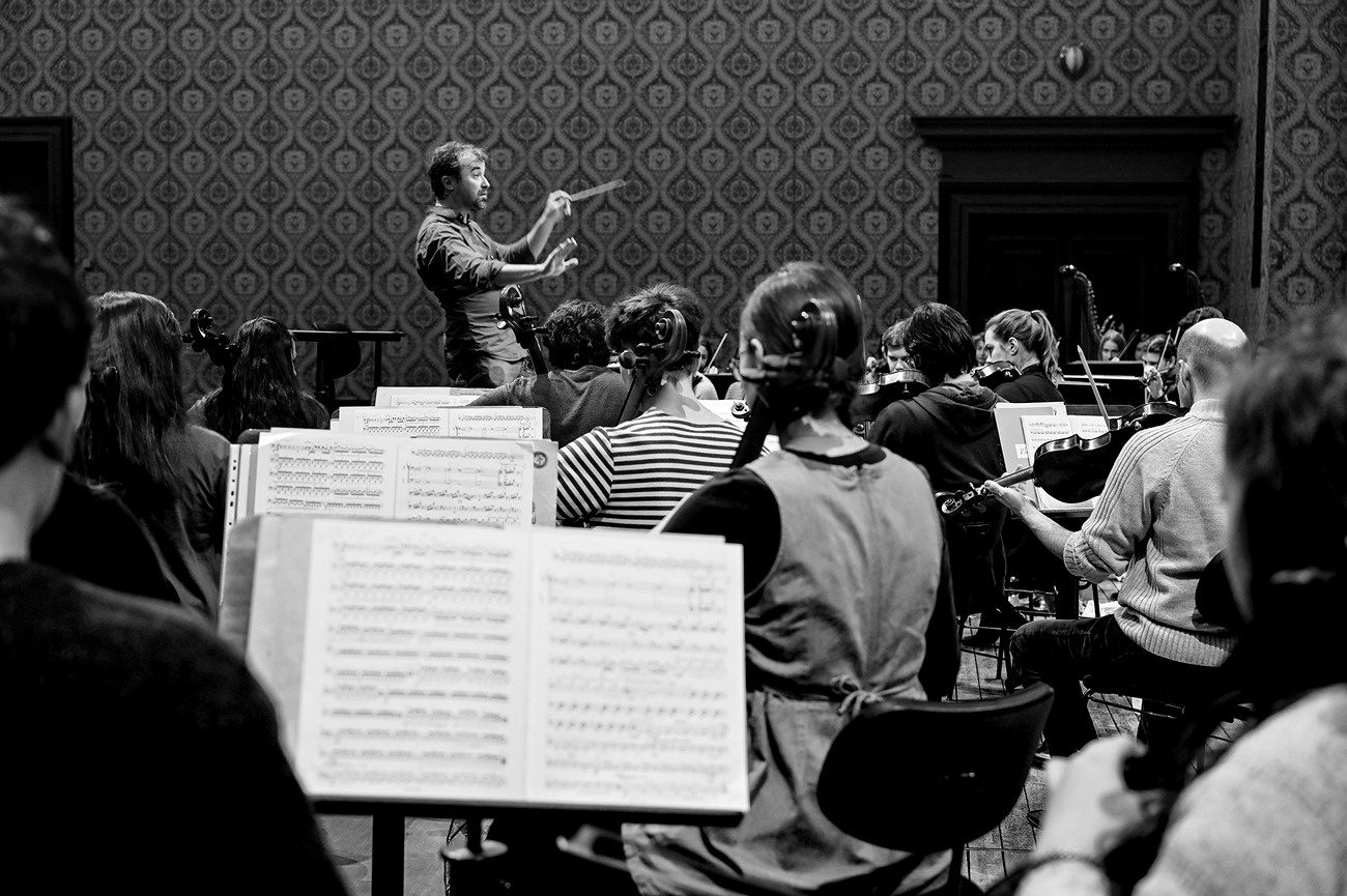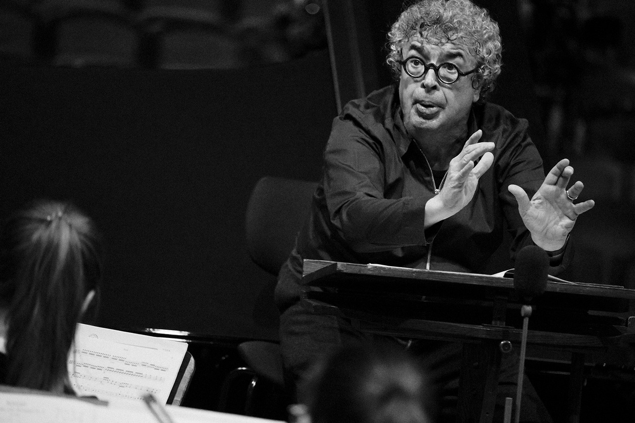 Mluví anglicky, tiše, laskavě, ale přesto s autoritou. Soustřeďuje se na artikulaci, na drobné akcenty, na to, kam hudba směřuje. Vysvětluje, jak docílit, aby hudební fráze uvnitř dýchaly, aby narůstaly, aby v polyfonii přecházely jedna v druhou, aby vyúsťovaly, kam mají… Vysvětluje význam rozdílů mezi forte a fortissimem, poznamenává, že v divadelním orchestřišti mají hudebníci jiný pocit zvuku než publikum, a připomíná, že obecně zní výsledek trochu jinak navenek a jinak v rezonanci, kterou každý cítí v sobě… Nabádá, aby si skupiny vzájemně naslouchaly, aby hráči v tutti vnímali i jiné linky než jen svůj part, aby si houslisté uvědomili, že v nejvyšší poloze je jejich tón už moc tenký. Propracovává „tóny mezi tóny“, tedy kontext, zkouší se smyčci směřování, vývoj a smysl motivu, který sice není v celku výrazně slyšet, ale přesto je důležitý… Vysvětluje, jak předávat energii z tónu na tón, učí vnímat celek, vyžaduje nechat v jednom okamžiku prostor druhým houslím, protože mají chvíli hlavní slovo, ale sedí méně výhodně uvnitř orchestru… Navrhuje všímat si víc varírování motivků, upozorňuje, ať tóny nejsou bezmyšlenkovité. Předzpěvuje espressivo. „Dejte těm dvěma notám víc času,“ poznamenává. O chvíli později řeší s tympánistkou měkkost úderu. A smyčcům za chvíli říká „…zpívejte srdcem“. Pracuje, radí, vyučuje.