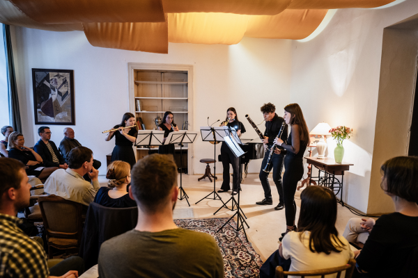 Na úvod večera zazní Sonáta pro lesní roh, trubku a trombon od Francise Poulenca v podaní hornistky Zuzany Meierové, trumpetisty Davida Ševčíka a trombonisty Tomáše Pavíčka. Mladé houslistky Milada Šulcová a Moena Zushi se ujmou skladby Pabla de Sarasateho Navarra, která nese jméno jeho rodné provincie a je jedním z jeho nejhranějších a nejvirtuóznějších opusů. Houslové duo v Salonu Celetná doplní klavírista Stanislav Bogunia. Flétnistky Žofie Hrubá Součková a Eliška Bošková přednesou Flétnový duet č. 1, op. 80 Friedricha Kuhlaua. Obě jsou již zkušenými interpretkami, úspěšně sólově vystoupily v rámci PKF – Prague Philharmonia na koncertech soudobé hudby. „Dále akademici zahrají skladbu B. H. Crusella. V jeho Divertimentu C dur, op. 9 pro smyčcové kvarteto a hoboj se představí Magda Routová, Barbora Jirsová, Karolína Franclíková, Keishiro Mikawa a Tereza Tourková, nadaná hobojistka, která letos zahraje mimo jiné na Lednicko-valtickém hudebním festivalu.“ uvádí produkce. Poslední skladbou večera bude Londýnské trio č. 3 G dur Josepha Haydna. Tato skladba zazní v interpretaci hobojistky Terezy Tourkové, fagotisty Štěpána Jinka a flétnistky Elišky Boškové.