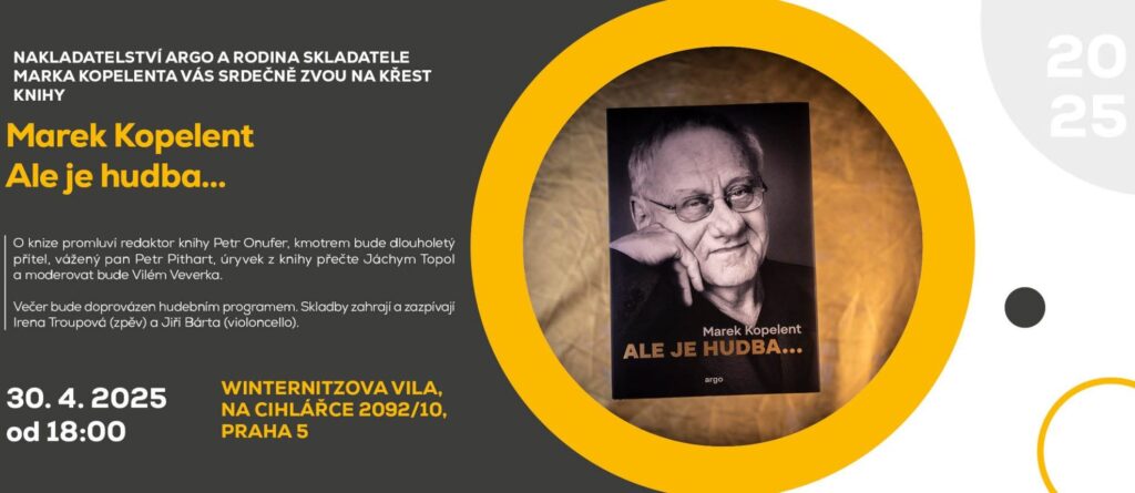 Český hudební skladatel Marek Kopelent sepsal před svou smrtí paměti s názvem Ale je hudba… Nakladatelství Argo knihu v letošním roce vydalo a spolu se skladatelovou rodinou pořádá ve středu 30. dubna od osmnácti hodin v pražské Winternitzově vile její křest. Hudebními hosty budou sopranistka Irena Troupová a violoncellista Jiří Bárta, večerem provede hobojista Vilém Veverka.