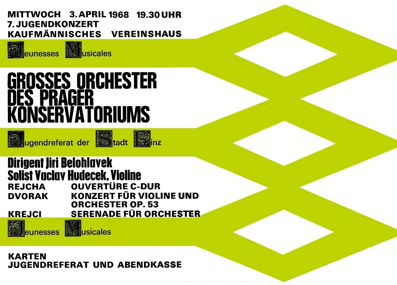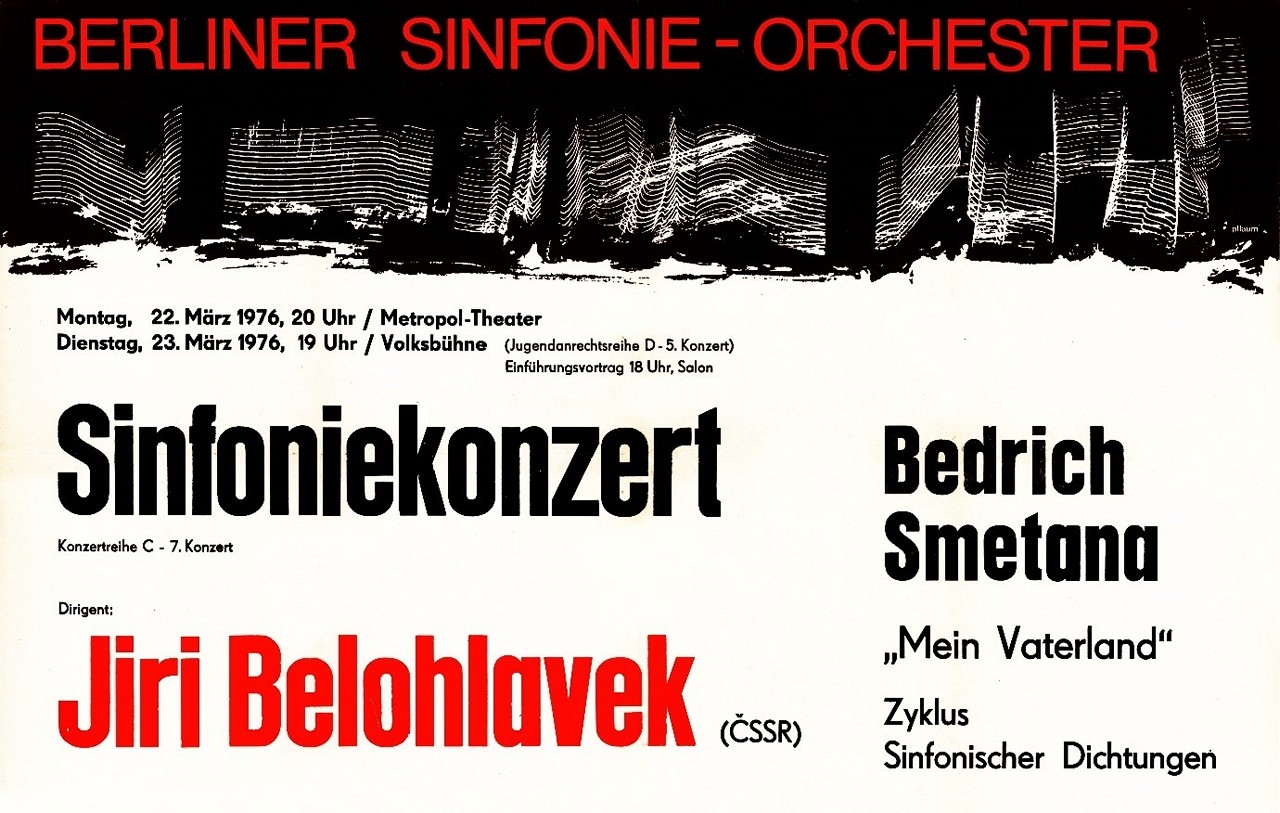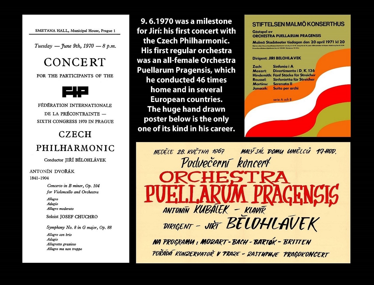 Devátý červen 1970 byl pro Jiřího milníkem: jeho první koncert s Českou filharmonií. Byl to nemalý skok od dirigování dívčího orchestru Puellarum Pragensis, který vedl doma i v zahraničí celkem šestačtyřicetkrát. Ručně kreslený plakát je jediný svého druhu mezi stovkami, které mám zpracované ve svém archivu.