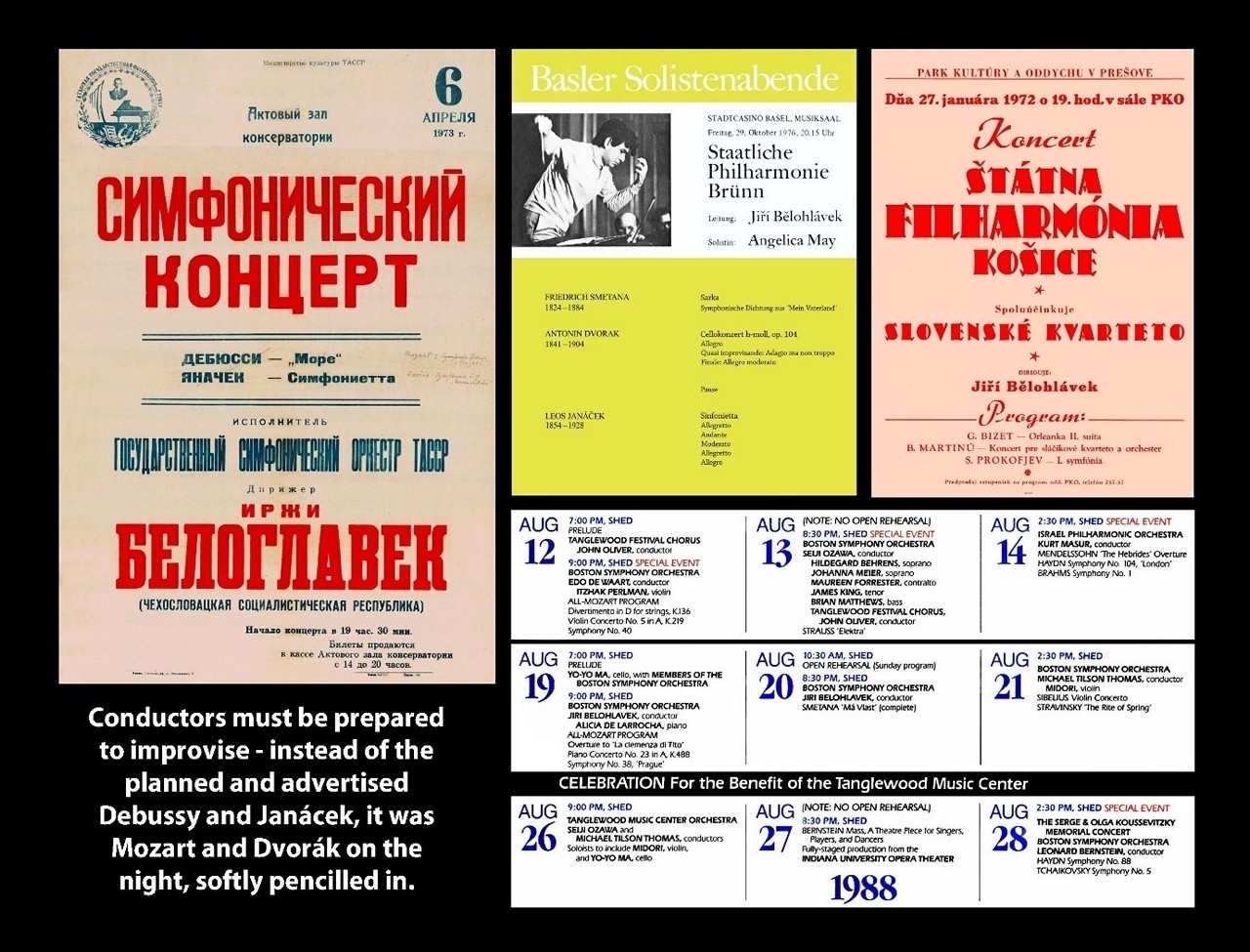 Plakát vystoupení s orchestrem TASSR by mohl ty z nás, kdo za socialismu od rána do večera museli narážet na zprávy tiskové agentury Sovětského svazu zvané TASS zmást, že agentura snad měla i svůj symfonický orchestr. TASSR však byl Filharmonický orchestr Tatarské sovětské republiky, kam Jiří letěl na koncert s poněkud nejistými očekáváními. Jak se ukázalo, oprávněnými: krátce po příletu byl nesměle informován, že Debussyho Moře a Janáčkovu Sinfoniettu by orchestr interpretoval s nemalými problémy. Jiřího optimismus, jak se jistě vše překoná, nestačil, neboť v další várce informací dostal už jednu zcela jasnou: ani jedny noty nedorazily a už nedorazí. A tak na koncertě zazněly, jak je na plakátě tužkou připsáno, Mozartova Pražská a Dvořákova Novosvětská symfonie. Jiřího jsem se neptal, zda bylo tatarské obecenstvo vůbec se změnou programu srozuměno. Už nikdy bych se totiž neodvážil nikoho podceňovat poté, co jsem před lety zhlédl v Londýně úchvatný televizní dokument, v němž Jevgenij Jevtušenko recitoval své básně v jakési zapadlé sibiřské továrně tomu nejprimitivněji vyhlížejícímu, avšak oddaně vzhlížejícímu publiku, které ve skutečnosti znalo všechny básně nazpaměť a namísto dojatého slzícího Jevtušenka je recitovalo samo…