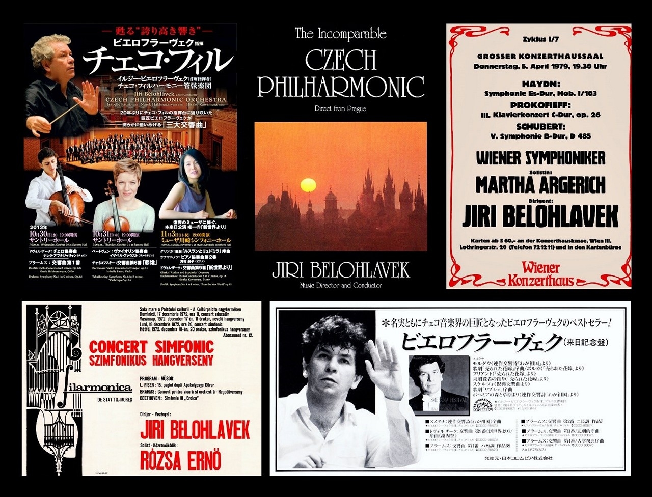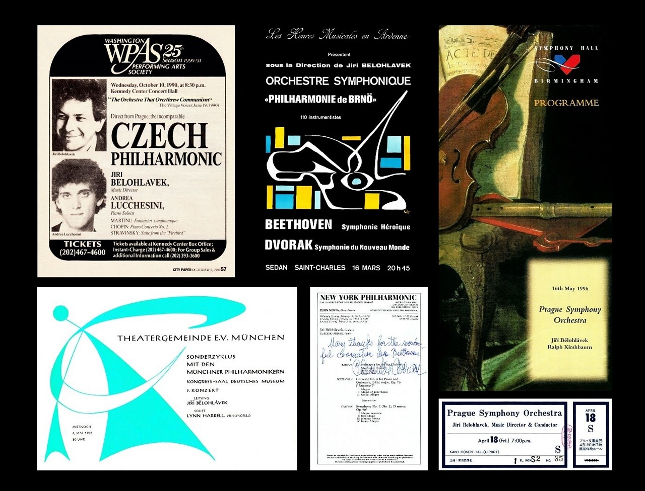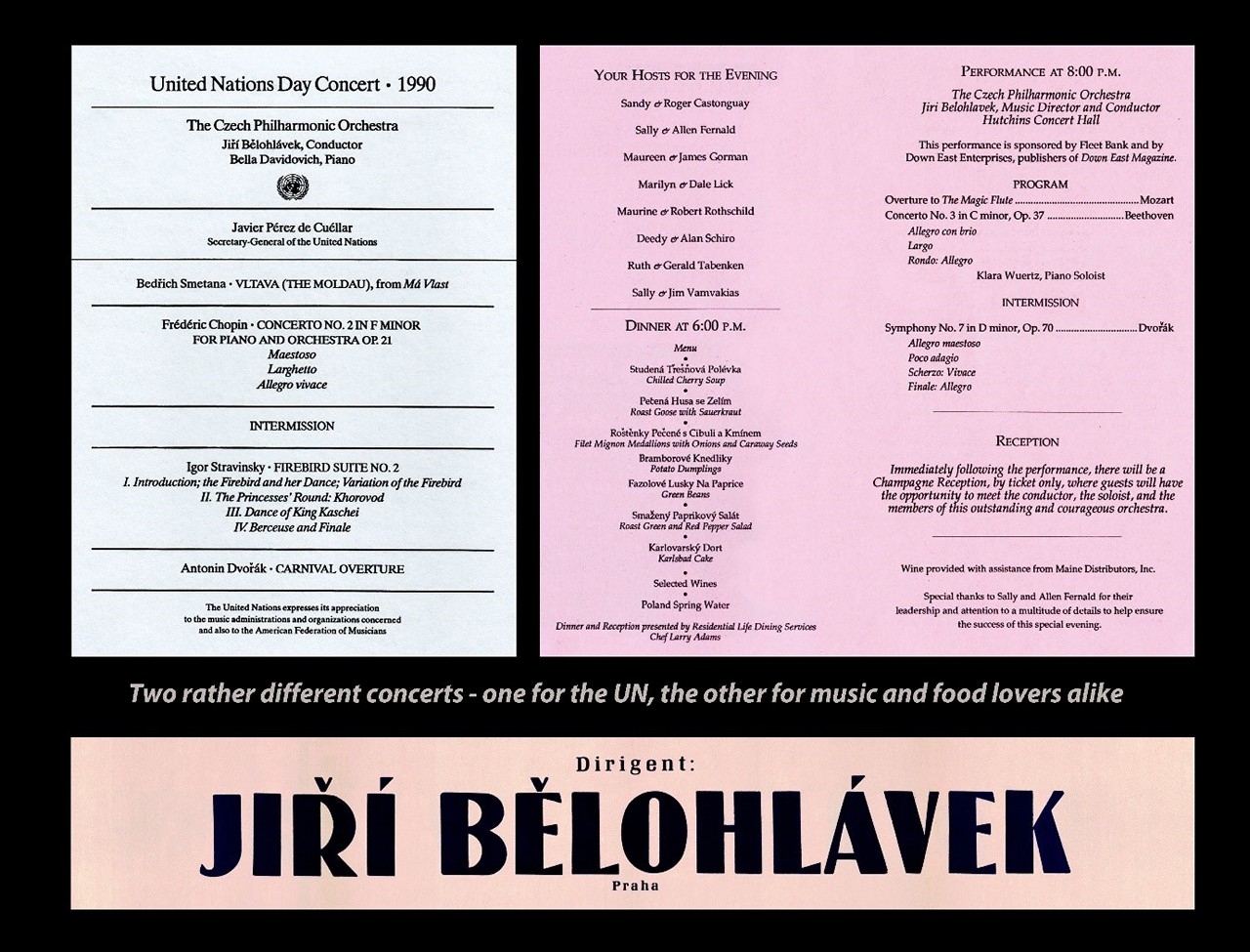 Jiří Bělohlávek se úspěšně snažil vyhýbat celé řadě slavnostních socialistických koncertů, ale dirigovat na koncertě Dnu Spojených národů v roce 1990 bylo něco docela jiného a opravdové privilegium. Z amerického turné s Českou filharmonií mě z nejrůznějších dokumentů ještě zaujal program s šampaňskou recepcí a slavnostní večeří, kde si organizátoři dali velkou práci nejen s výběrem českých jídel a nápojů, ale především s diakritikou. Bylo by zbytečné pozastavovat se nad pozoruhodnostmi jako byly Smažený Paprikový Salát či Studená Třešňová Polévka, neboť ta diakritika je obdivuhodná – jen se háčků a čárek už paradoxně nedostalo na jméno Jiri Belohlavek. Jiří byl jak zvyklý na různé verze svého jména a gurmán k tomu, tak snad mu večeře leccos vykompenzovala. Neprobírali jsme to a níže jsem připojil ústřižek z jiného plakátu dokumentujícího, jak ke korektnosti někdy stačí i málo.