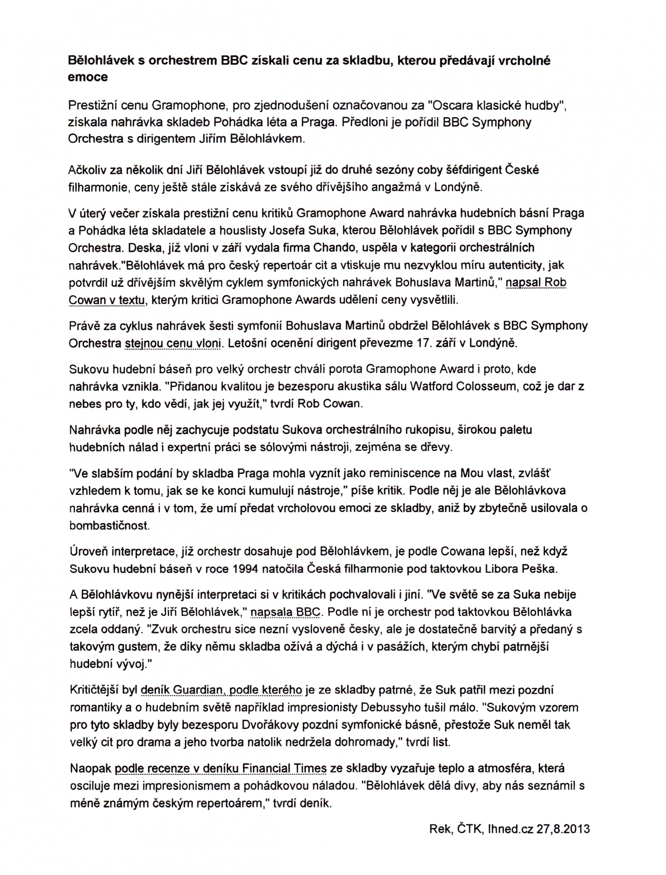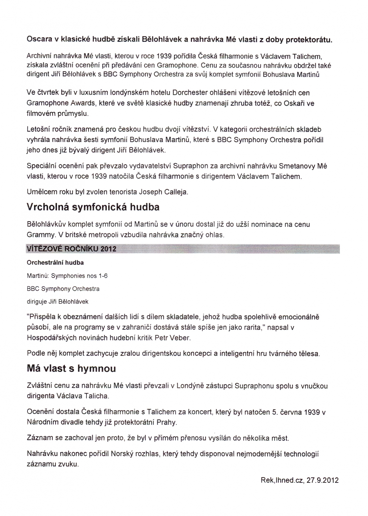 Nahrávky Jiřího Bělohlávka slavily mimořádné úspěchy doma i v zahraničí, jak dokumentují dnešní přílohy spolu se zajímavým rozhovorem o natáčení kompletu Dvořákových symfonií v Rudolfinu. Na první fotografii drží Jiří Bělohlávek v rukou JUBILEJNÍ PLATINOVOU DESKU za významný přínos v prosazování české hudby a za významný vklad do umělecké kvality značky Supraphonu. Další přílohy nepotřebují komentáře.