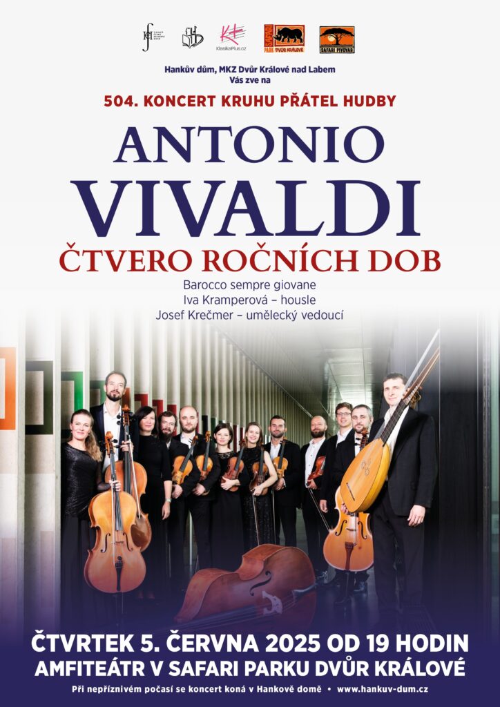 Hostem posledního koncertu padesáté sedmé sezóny Kruhu přátel hudby ve Dvoře Králové bude komorní orchestr Barocco sempre giovane, který na české i mezinárodní koncertní scéně působí již dvě dekády. Pořadatelé u této příležitosti zvolili ryze vivaldiovský program. Vedle kompletního provedení čtveřice houslových koncertů Čtvero ročních dob op. 8/1-4, jejichž sólový part přednese houslistka Iva Kramperová, závěrečný večer nabídne také Vivaldiho Sinfonii C dur L’Olimpiade.