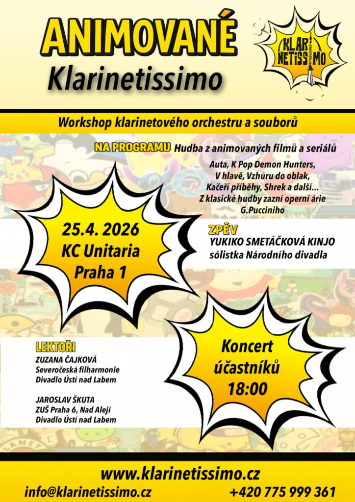 V prostorách KC Unitaria se uskuteční další ročník projektu Animované Klarinetissimo, za nímž stojí spolek Klarinetissimo. Akce, organizovaná klarinetisty Zuzanou Čajkovou a Jaroslavem Škutou, cílí především na studenty základních uměleckých škol, konzervatoří i širší komunitu amatérských a pokročilých hráčů. Nejde však o tradiční workshop, organizátoři staví na konceptu živé hudební laboratoře, kde se účastníci zapojují do orchestrální i komorní hry, rozvíjejí své technické dovednosti a současně získávají zkušenosti s kolektivní interpretací.