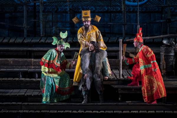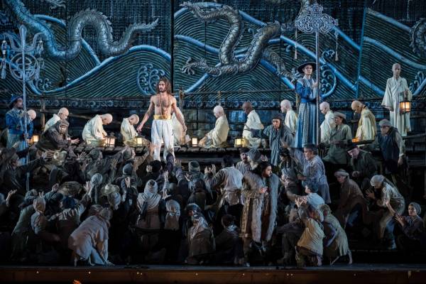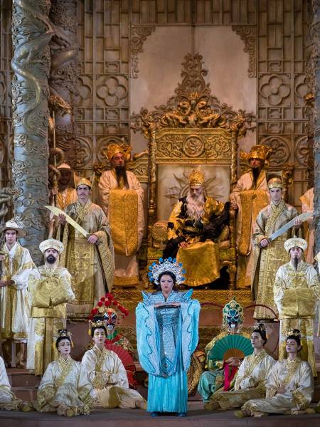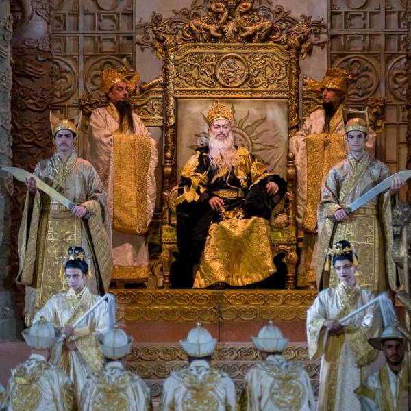 Režisér Franco Zeffirelli do svého vyjadřovacího divadelního slovníku pohybů a gest zakomponoval prvky a herecké techniky inspirované asijskou divadelní kulturou, které s vtipem i jistou dávkou tajemnosti perfektně ovládli ministři císaře Altouma, Ping, Pang a Pong. Albánský barytonista Gezim Myshketa, italský tenorista Riccardo Rados a italský tenorista Matteo Mezzaro je ztvárnili s humorem a nonšalancí. Publikum v závěru bouřlivě aplaudovalo.