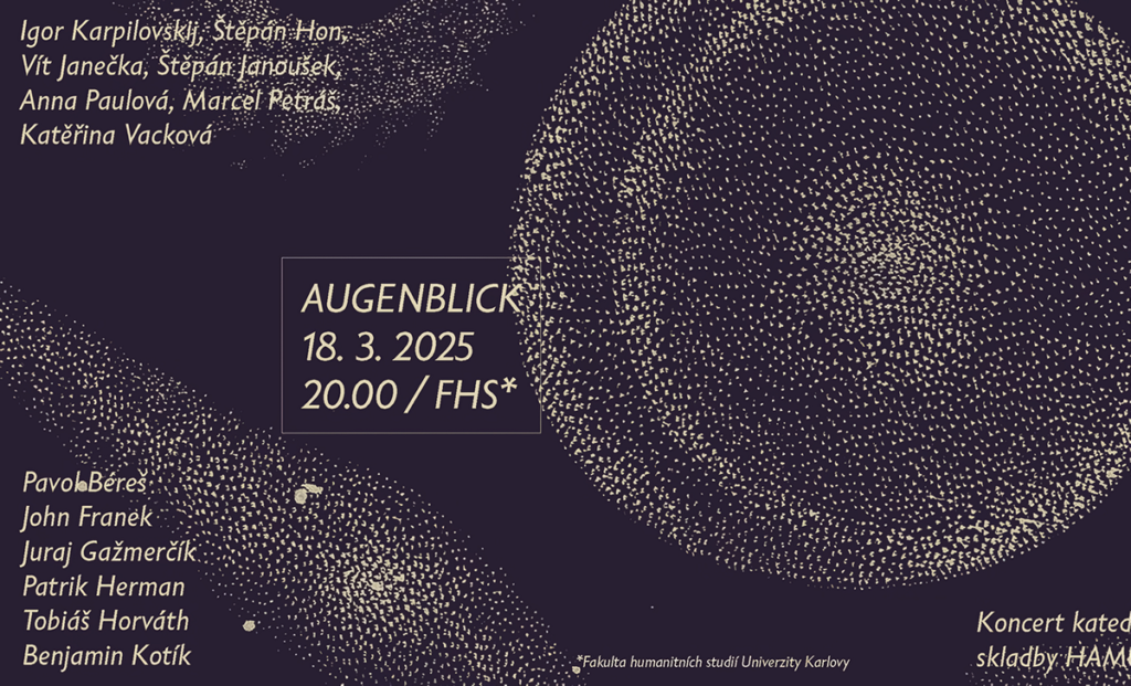 „Zvuk se šíří prostorem v čase. Bez prostoru a času není zvuku. Zachytit ojedinělé záblesky existence zvuku v prostoru, zastavit je v představivosti, dát jim kus nové pozornosti, proposlouchat je z různých stran a perspektiv…“ Tímto mottem opatřili zástupci katedry skladby pražské HAMU další z řady tradičních koncertů, na nichž představují nové komorní skladby. V úterý 18. března své novinky připravené speciální pro koncert ve dvoraně Fakulty humanitních studií Univerzity Karlovy uvede šestice skladatelů: Pavol Béreš, John Franek, Juraj Gažmerčík, Patrik Herman, Tobiáš Horváth a Benjamin Kotík. Ti všichni se nechali inspirovat prostorem, který není běžným koncertním sálem, ale odráží spíše všední realitu univerzitních dní. Výsledkem je projekt Augenblick, tedy okamžik, v němž se ze zvuku povstává hudba. „Pavol Béreš pracuje s abstrakcemi a asociacemi archetypálních představ. John Franek se pokouší přenést abstraktní pohyby vlastních myšlenek do fyzického prostoru. Juraj Gažmerčík se nechává inspirovat situací v šachu, v níž je hráč přinucený k realizaci nevýhodného tahu. Patrik Herman přemýšlí o komunikaci mezi ansámblem a paralelním světem. Tobiáš Horváth rozehrává konceptuální hru mezi psanými a číselnými symboly. Benjamin Kotík se pokouší uvnitř fyzického prostoru vytvořit nový prostor virtuální,“ doplňují k obsahu projektu pořadatelé. O interpretaci se postarají vibrafonista Štěpán Hon, houslista Vít Janečka, trombonista Štěpán Janoušek, klarinetistka Anna Paulová a kontrabasistka Kateřina Vacková. Provedení bude řídit Igor Karpilovskij.