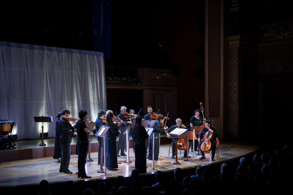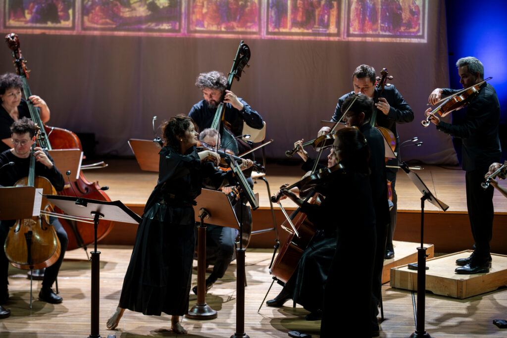 Jestliže jsme první polovinu koncertu brali především jako odkaz k utrpení pod ideologiemi 20. století, druhou polovinou se linulo téma utrpení Kristova. Náboženský prvek zde byl velice markantní i ve výběru „doplňkového“ repertoáru k již zmíněné Martinově skladbě. Mohli jsme zaznamenat reprezentanty dvou podob křesťanství, Machautovu Messe de Notre Dame a protestanské chorály, především z Janových pašijí J. S. Bacha, jež byly vloženy mezi jednotlivé věty/části Polyptyque. Vyvážily rostoucí napětí prostupující Martinovou skladbou. Jak se blížilo Kristovo ukřižování v příběhu Buoninsegnových obrazů, jež byly promítány na plátno za soubor, tak rostla emocionální tenze. Právě Bachovy chorály vždy přinesly chvíli útěchy. Po částech „Květná neděle“, „Horní místnost“, pojednávající o poslední večeři, přišel „Jidáš“ a v neuvěřitelně sugestivní interpretaci Kopatchinské se divákovi chtě nechtě sevřelo hrdlo. Mrazivý podtext „Zahrady Getsemanské“ už dovršil jen „Rozsudek“. Právě v průběhu této části se závěs, na který byly obrazy promítány, mohutně rozvlnil (i toto byl záměr?) a ještě umocnil tíživou atmosféru. Samotné Kristovo ukřižování Martin nezhudebnil, proto si projekt vypomohl zařazením skladby Crux Luboše Fišera, která dokonala to, na co jsme všichni čekali. Fišerovi stačily pouze dva nástroje, housle a tympány (resp. tři, protože tympánista v závěru vymění svůj nástroj za zvony), aby vylíčil hrůznost činu a zpodobnil ikonický obraz lidského utrpení. I závěrem koncertu však proznívala naděje a víra ve vykoupení, neboť Frank Martin uzavřel svůj cyklus Polyptyque částí „Velebení“, a celý projekt nakonec završil chorál „O große Lieb“ z Janových pašijí, při němž Kopatchinskaja vyzvala publikum ke společnému zpěvu. Myšlenka (snad?) kolektivního spojení v utrpení i naději se bohužel naplnila pouze částečně, protože ne každý z publika byl schopen chorál odzpívat zpaměti a programová brožura, jinak skvěle zpracovaná včetně textů zmíněných písní a jako vždy hluboce erudovaného slova Vlasty Reittererové, v tomto ohledu posluchačům nepomohla.