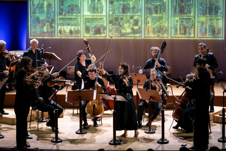 Jestliže jsme první polovinu koncertu brali především jako odkaz k utrpení pod ideologiemi 20. století, druhou polovinou se linulo téma utrpení Kristova. Náboženský prvek zde byl velice markantní i ve výběru „doplňkového“ repertoáru k již zmíněné Martinově skladbě. Mohli jsme zaznamenat reprezentanty dvou podob křesťanství, Machautovu Messe de Notre Dame a protestanské chorály, především z Janových pašijí J. S. Bacha, jež byly vloženy mezi jednotlivé věty/části Polyptyque. Vyvážily rostoucí napětí prostupující Martinovou skladbou. Jak se blížilo Kristovo ukřižování v příběhu Buoninsegnových obrazů, jež byly promítány na plátno za soubor, tak rostla emocionální tenze. Právě Bachovy chorály vždy přinesly chvíli útěchy. Po částech „Květná neděle“, „Horní místnost“, pojednávající o poslední večeři, přišel „Jidáš“ a v neuvěřitelně sugestivní interpretaci Kopatchinské se divákovi chtě nechtě sevřelo hrdlo. Mrazivý podtext „Zahrady Getsemanské“ už dovršil jen „Rozsudek“. Právě v průběhu této části se závěs, na který byly obrazy promítány, mohutně rozvlnil (i toto byl záměr?) a ještě umocnil tíživou atmosféru. Samotné Kristovo ukřižování Martin nezhudebnil, proto si projekt vypomohl zařazením skladby Crux Luboše Fišera, která dokonala to, na co jsme všichni čekali. Fišerovi stačily pouze dva nástroje, housle a tympány (resp. tři, protože tympánista v závěru vymění svůj nástroj za zvony), aby vylíčil hrůznost činu a zpodobnil ikonický obraz lidského utrpení. I závěrem koncertu však proznívala naděje a víra ve vykoupení, neboť Frank Martin uzavřel svůj cyklus Polyptyque částí „Velebení“, a celý projekt nakonec završil chorál „O große Lieb“ z Janových pašijí, při němž Kopatchinskaja vyzvala publikum ke společnému zpěvu. Myšlenka (snad?) kolektivního spojení v utrpení i naději se bohužel naplnila pouze částečně, protože ne každý z publika byl schopen chorál odzpívat zpaměti a programová brožura, jinak skvěle zpracovaná včetně textů zmíněných písní a jako vždy hluboce erudovaného slova Vlasty Reittererové, v tomto ohledu posluchačům nepomohla.