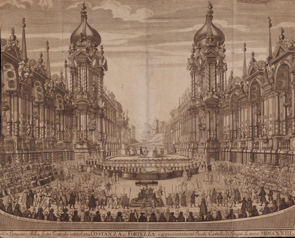 Scéna a představení „Costanza e fortezza“ na Pražském hradě, G. Galli Bibiena, 1723