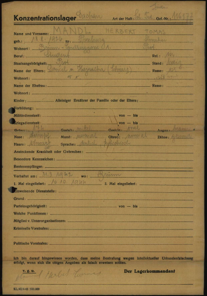 Registrační formulář Herberta Thomase Mandla jako vězně v nacistickém koncentračním táboře Dachau.