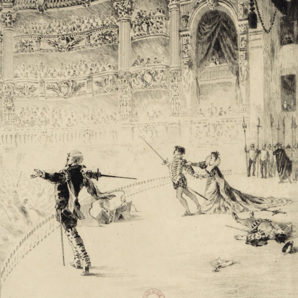 Scéna z pátého dějství Hugenotů – dobová ilustrace (Pařížská opera 1875)