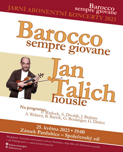 Hostem abonentního koncertu souboru Barocco sempre giovane ve Společenském sále zámku v Pardubicích bude houslista Jan Talich. Působí jako vyhledávaný sólista, komorní hráč, dirigent a pedagog téměř po celém světě. Se souborem tentokrát uvede zcela „nebarokní“ program. Koncert se koná ve čtvrtek 25. května v devatenáct hodin.