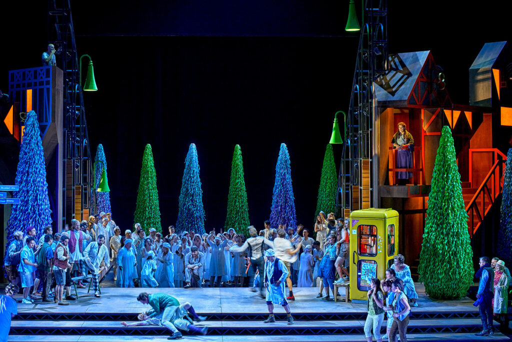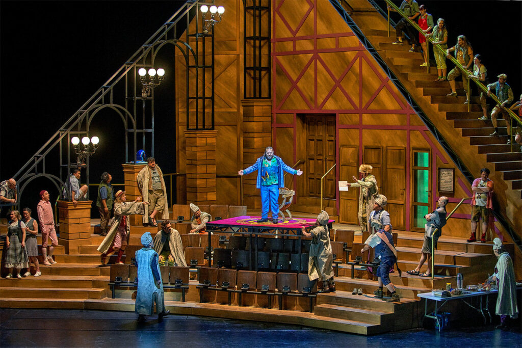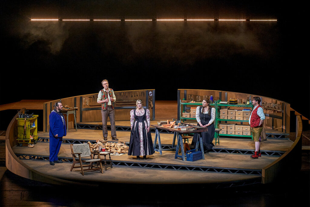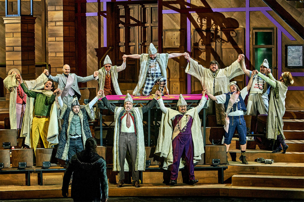 Režisér Matthias Davids vede Mistry pěvce cíleně k poloze vyhovující širokospektrálnímu publiku. Jeho Norimberk není muzeum ani pamflet, nýbrž živé město, v němž se tradice a inovace neustále přetlačují. Andrew D. Edwards taktéž staví proměnlivý geometrický prostor a Susanne Hubrich obléká postavy do pastelově laděného současna; ironie tady funguje jako jemná antihmota patosu, nikoli jako výsměch. Zkrátka jde o přístup, který se vědomě vyhýbá extrémům od Wielandova „Norimberku beze zdí“ (Bayreuth, 1956) přes groteskně strašidelný Aldenův obraz Sachse/Hitlera (Amsterdam, 2013) až po Koskyho norimberskou soudní síň, kde na lavici obžalovaných usedl sám Wagner (Bayreuth, 2017). Davids nezatěžuje inscenaci hledáním viníků, ale otevírá prostor, v němž se střetává řád cechu se svobodou tvůrce a vnímá umění jako zrcadlo společenské normy.