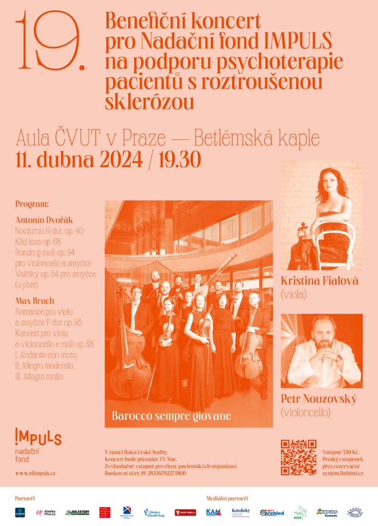 Přední česká violistka, která je dlouholetou ambasadorkou Nadačního fondu Impuls (NFI), připravila program tradičního benefičního koncertu pro nemocné s roztroušenou sklerózou podeváté v řadě, letos si na pódium znovu přizvala violoncellistu Petra Nouzovského. Dvojici doprovodí komorní soubor Barocco sempre giovane, který na této akci vystoupil již před sedmi lety. Večerem, jehož výtěžek putuje na nezbytnou psychoterapii pro lidi s nevyléčitelnou nemocí, tentokrát provede herec a moderátor Jan Čenský.