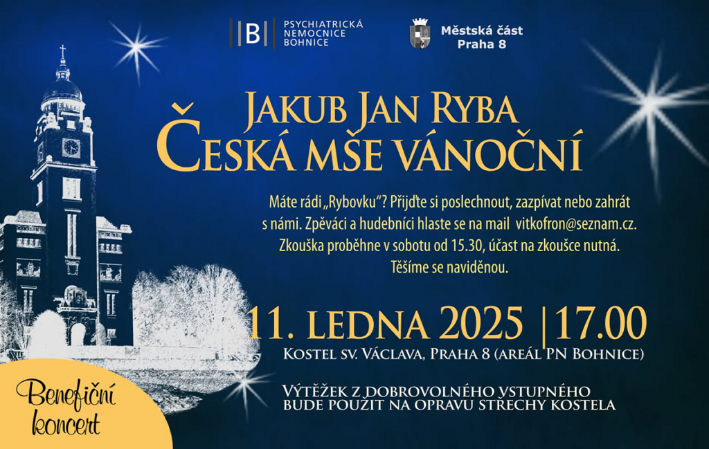 Missa Solemnis festis Nativitatis Domini Jesu Christi accomodata in linguam Bohemicam aneb Česká mše vánoční Jakuba Jana Ryby zazní na jednom z posledních provedení v končícím čase vánočním v pražských Bohnicích. Místní hudebníci a jejich přátelé se zapojením veřejnosti provedou verzi od Vojtěcha Spurného v prostorách kostela svatého Václava umístěného v areálu tamnní Psychiatrické nemocnice. Střecha secesního kostela v majetku léčebny je v havarijním stavu, a proto je akce Bohnická Rybovka v letošním roce pořádána jako benefiční koncert, jehož výtěžek bude použit na její rekonstrukci. Společné vystoupení amatérských i profesionálních hudebníků bude dirigovat Jan Hádek.