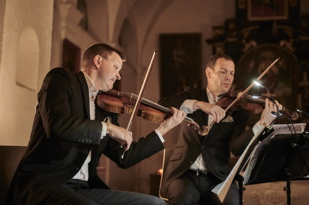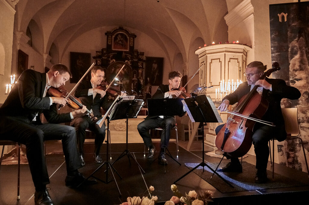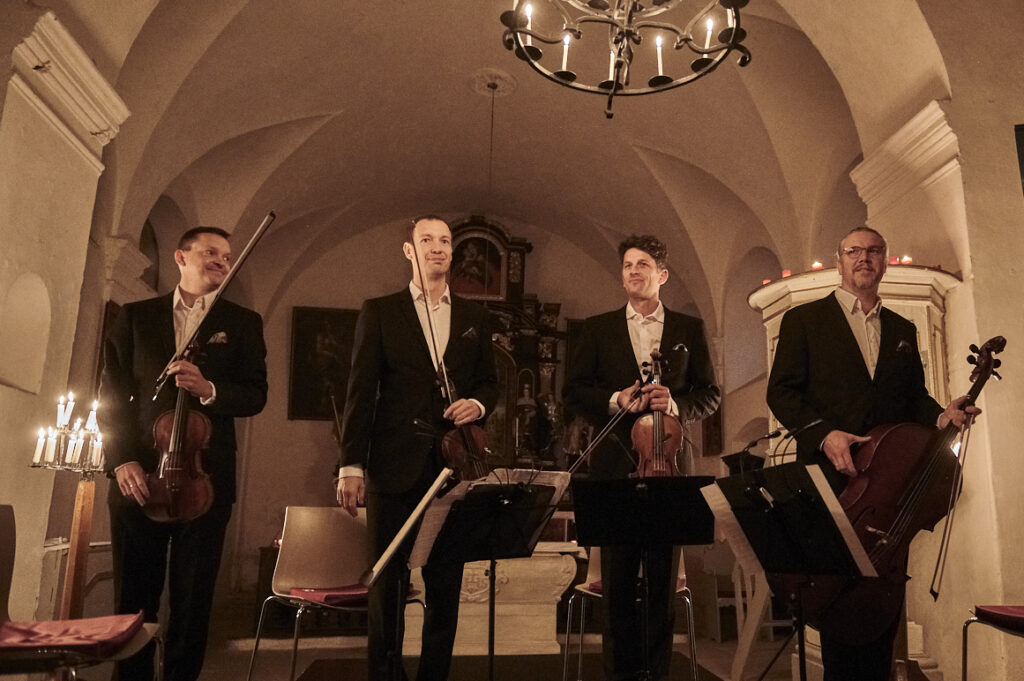 Byl to tak trochu koncert pro fajnšmekry, ostatně Bennewitzovo kvarteto neboli Jakub Fišer na první a Štěpán Ježek na druhé housle, Jiří Pinkas na violu a Štěpán Doležal na violoncello to ani jinak neumí. Připomeňme třeba nahrávku terezínských autorů nebo Dvořákovy Cypřiše. Jejich letošní novinka Večer ve Vídni 1784, která vyšla u Supraphonu teprve před pár dny, se nese ve stejném duchu. Nabízí netypickou dramaturgii, silný příběh a hlavně promyšlený zvuk, přestavující čtyři současníky Haydna, Dittersdorfa, Mozarta a Vaňhala, každého v jejich jedinečnosti. Koncert v Zahrádkách s podtitulem Musica alla viennese na novou desku navázal. Zazněl Smyčcový kvartet G Dur, op. 33: č. 5 Josepha Haydna a Smyčcový kvartet C Dur, KV 465 Wolfganga Amadea Mozarta „Disonantní“. Obě skladby hráči doplnili známou dlouhou větou Heiliger Dankgesang ze Smyčcového kvartetu č. 15 a moll, op. 132 Ludwiga van Beethovena.