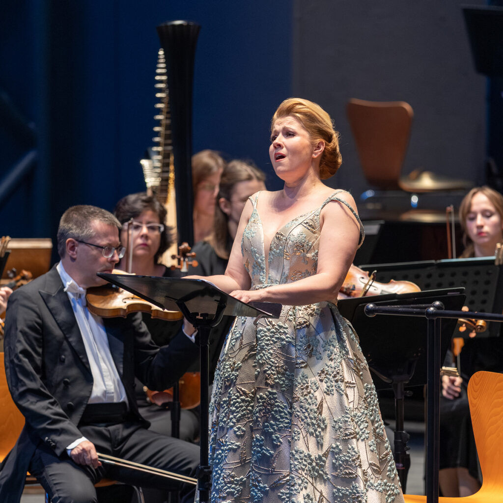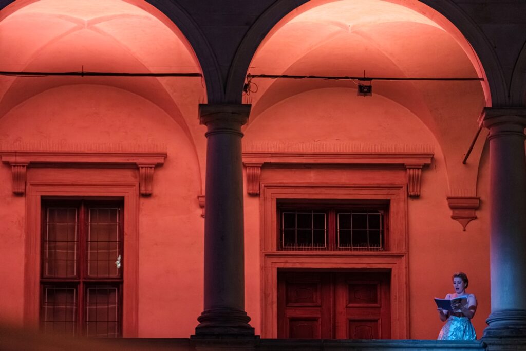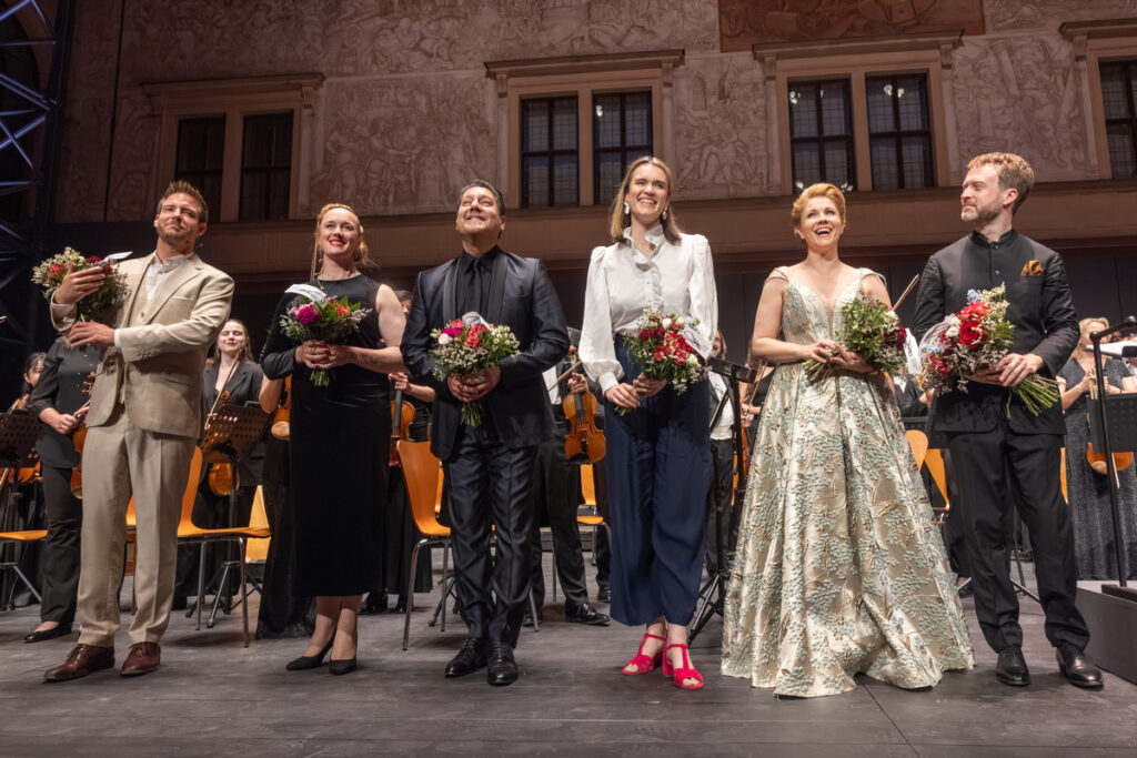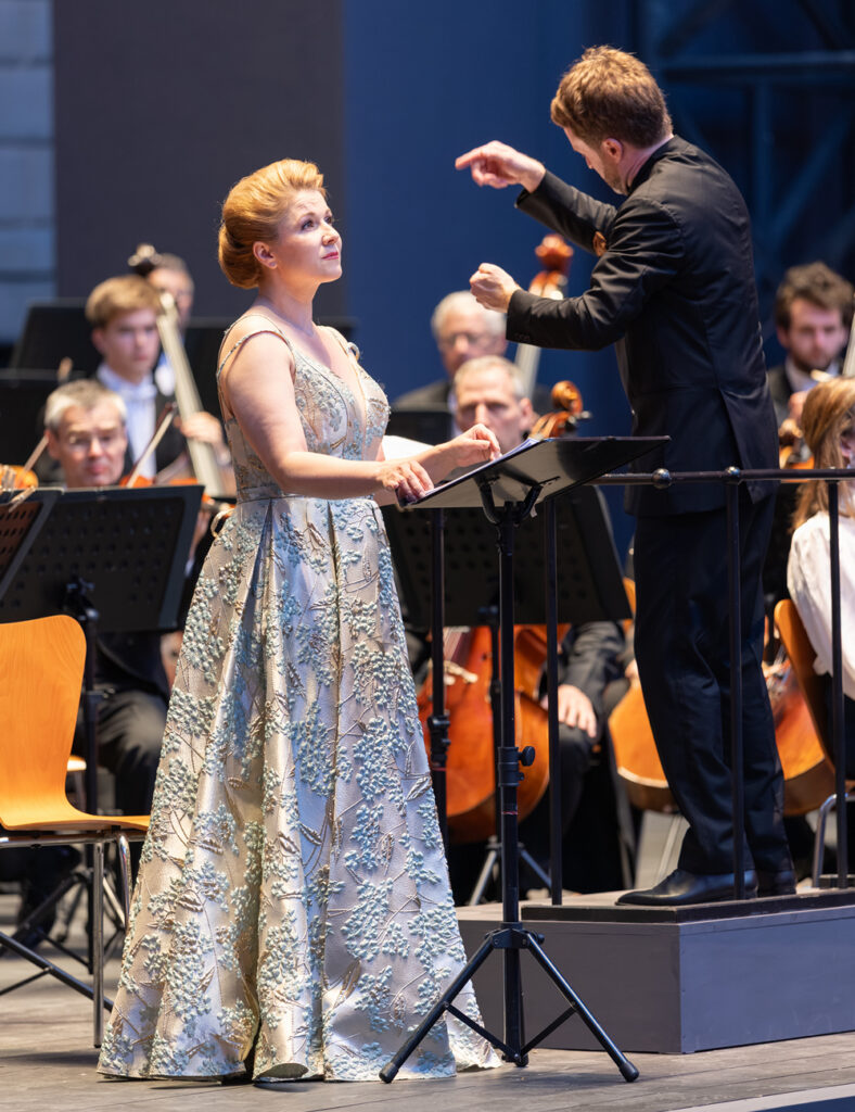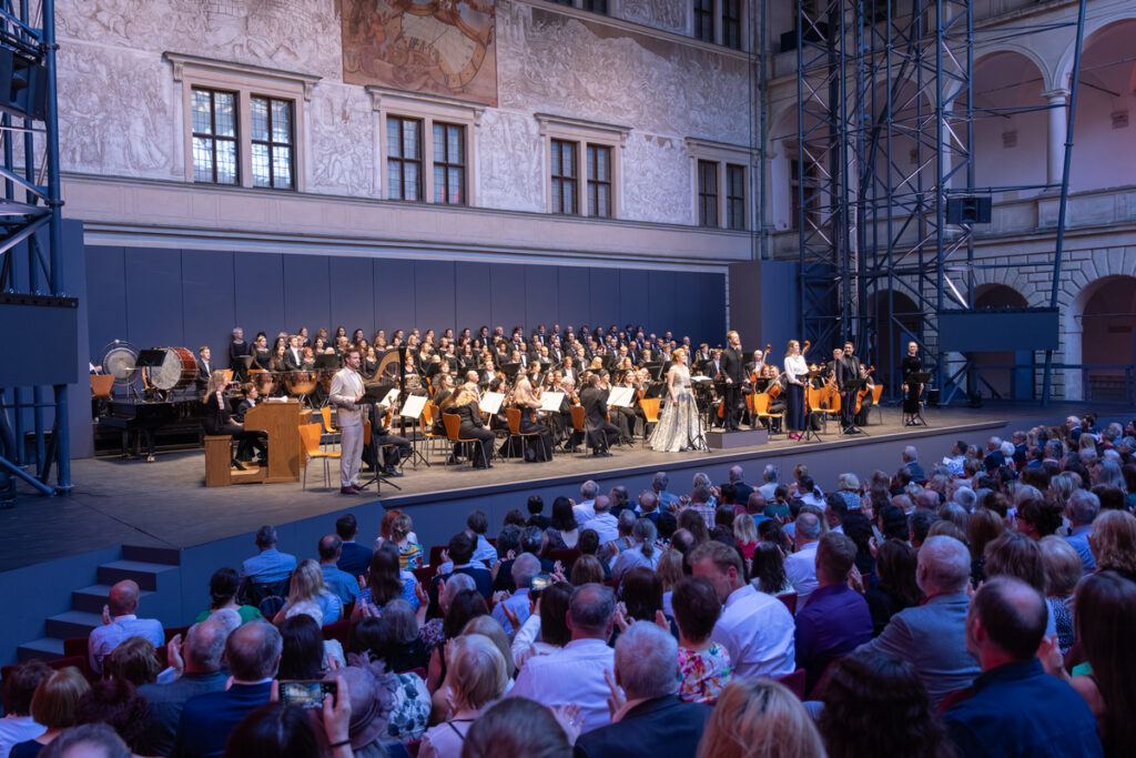 Provedení ozdobila na pódiu ve vyklenutých, nosných sopránových sólech Kateřina Kněžíková, v samém závěru pak ještě přispívající do chvalozpěvu jako andělský hlas z výšky, ze zámecké arkády. Druhou sólistkou byla altistka temnějšího témbru Helen Charlston a s ní noblesně zpívající německo-turkmenský tenorista Dovlet Nurgeldiyev.