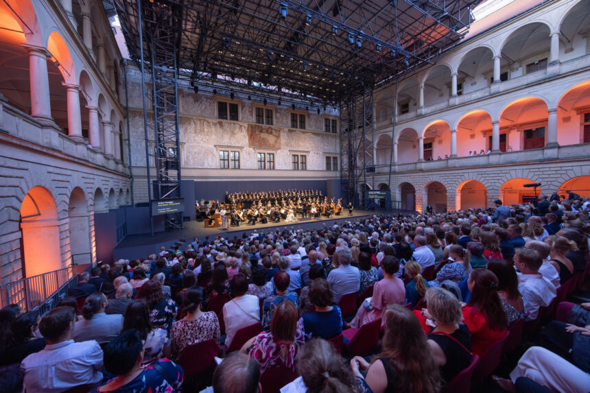 Provedení ozdobila na pódiu ve vyklenutých, nosných sopránových sólech Kateřina Kněžíková, v samém závěru pak ještě přispívající do chvalozpěvu jako andělský hlas z výšky, ze zámecké arkády. Druhou sólistkou byla altistka temnějšího témbru Helen Charlston a s ní noblesně zpívající německo-turkmenský tenorista Dovlet Nurgeldiyev.