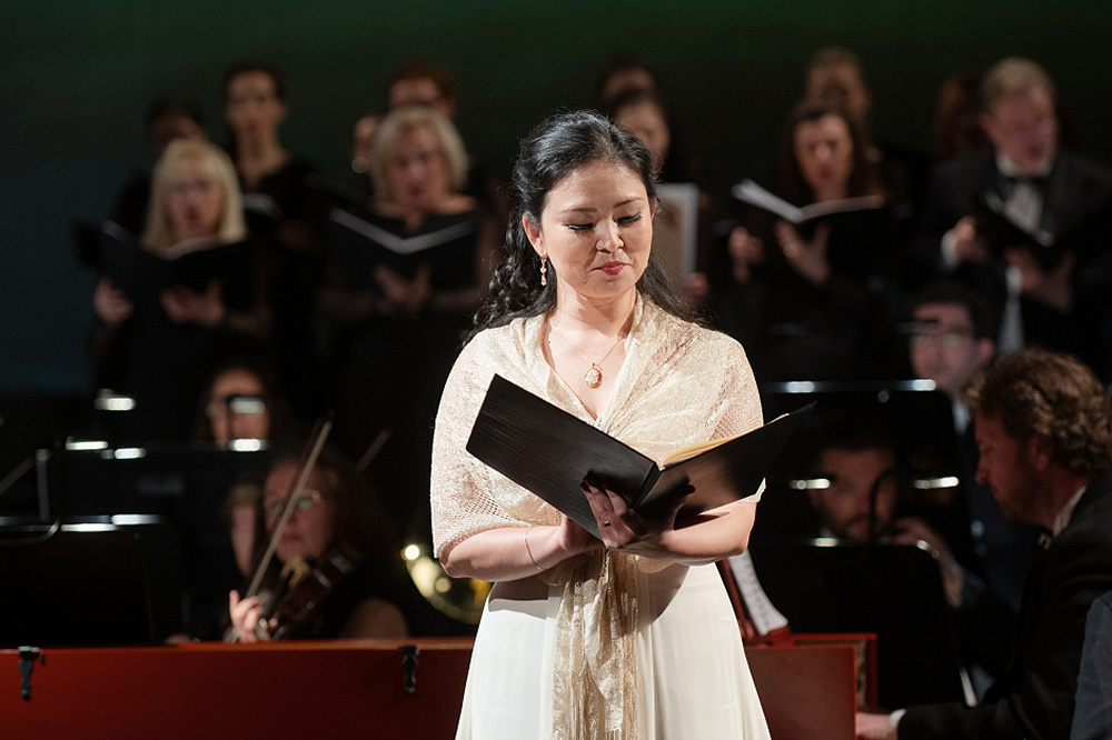 Sopránové sólo na plzeňské Nové scéně zpívá Yukiko Smetáčková Kinjo v alternaci s Lucií Silkenovou, barytonový part ztvární Moses Mackay střídaný s Františkem Zahradníčkem. Zásadní a obtížnou sborovou partii nabídnou společně Vysokoškolský umělecký soubor Univerzity Karlovy v Praze a Sbor opery DJKT připravené Jakubem Zichou. Do konce sezony se uskuteční ještě sedm repríz, ta nejbližší 18. března.