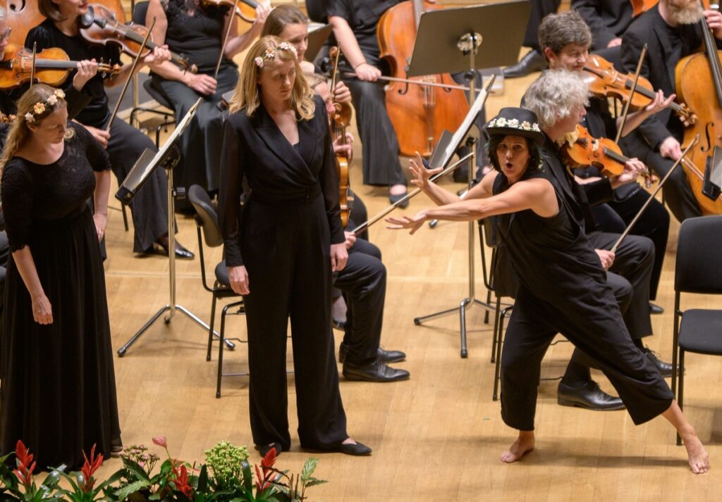 První skladbou byla romantická skladba Sen noci svatojánské, scénická hudba, op. 21/61. Už Ouvertüre uchopila posluchače jemným pletivem hudební pavučiny, kterým všechny v sále postupně spoutala. Další části postupně představovaly postavy z dramatu Williama Shakespeara, vystupující postupně z portálů a přednášely svůj text. Zaujali lehkostí přednesu a přesnou a pečlivou dikcí, takže bylo rozumět každému slovu. Orchestr je pečlivě podporoval a nikdy je nekryl. Efekt vylehčeného, běžícího rytmu od počátku určoval vyznění skladby a výsledkem byl tvar plný půvabu a elfího víření. Dokonce i scény divadla, připravovaného amatérskými herci, místními řemeslníky, působily velmi půvabně a křehce. Herci se střídali podle potřeby v předepsaných rolích, všichni byli v černém a vytvářeli dokonale homogenní umělecký tvar, jak vizuální, tak hudební. Helena a Hermie byly něžné a půvabné, Titanie, královna skřítků víl, měla noblesu i pevnost, i když podléhala nehezkému žertu. Oberon měl vznešenost, stejně jako Tezeus, a ten, který to vše nastrojil, Puk, měl jak jiskru, tak i moudrost, kterou uzavřel celý příběh. Vyrovnanost jednotlivých výkonů byla obdivuhodná. Hlavní roli a nosnost příběhu však měl orchestr, který neustále držel pevný tah a dirigent neupustil ani píď. Jen při forte orchestru, kdy zněl plně Svatební pochod, si posluchač najednou uvědomil, že zvuk žesťů je oproti dnešním nástrojům drsnější. Nicméně publikum bylo nadšené a děkovalo umělcům, před kterými ale ještě byl velký úkol.