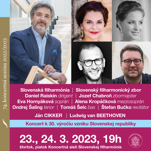 Ve čtvrtek 23. a v pátek 24. března se bude v bratislavské Redutě konat další dvojice koncertů Slovenské filharmonie pod taktovkou šéfdirigenta Daniela Raiskina. V jeho nastudování zazní dvě vokálně-instrumentální díla, a to oratorium na slova Milana Rúfuse pro sólisty, recitátora, smíšený sbor a orchestr Óda na radost Jána Cikkera a Symfonie 9 d moll, op. 125 s Ódou na radost Ludwiga van Beethovena na Schillerův text. Vedle prvního slovenského orchestru vystoupí Slovenský filharmonický sbor, sólisté Eva Hornyáková, Alena Kropáčková, Ondrej Šaling, Tomáš Šelc a recitátor Štefan Bučko. Před pátečním koncertem je na programu ve foyeru setkání s šéfdirigentem. Hudební setkání budou oslavou třicátého výročí vzniku Slovenské republiky. Státní filharmonie Košice na čtvrtek 23. března přichystala se šéfdirigentem Robertem Jindrou do Domu umění koncert s tématem Pohádek tisíce a jedné noci…