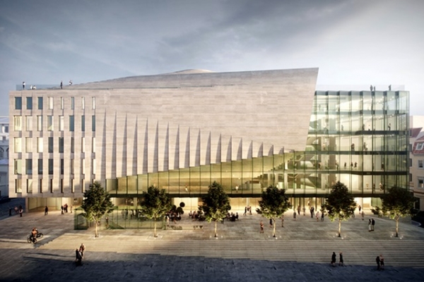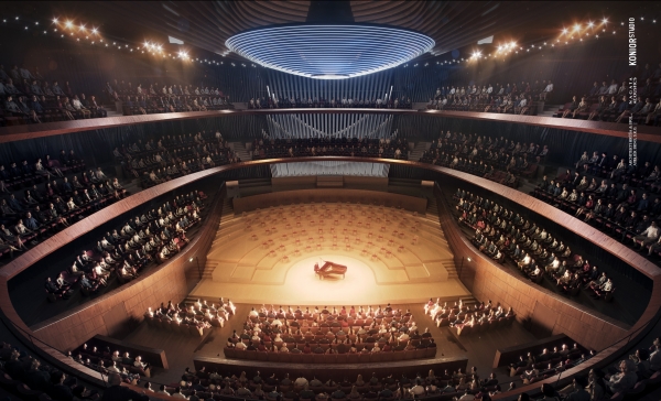 Charakteristickým rysem stavby má být dualita viditelná zvnějšku i uvnitř – spojení uzavřené masivní struktury podřízené hudbě, užívající jako materiály beton a dřevo, a transparentní prosklené struktury otevřené lidem. „Parcela je relativně malá, byla pro nás výzvou,“ připustil generální projektant Tomasz Konior. Rozhodně však nepovažuje svůj návrh za kompromisní. Sám, jak říká, měl vždy za cíl navrhovat stavby, které nechtějí být zatíženy komplexy z minulosti, aniž by však musely být za každou cenu originální. Brněnská budova obsáhne pokračování veřejných prostor v parteru i dvě terasy na střeše, umožňující výhled na město, bude mít příjemné prostory pro posluchače a důstojné zázemí pro hudebníky.