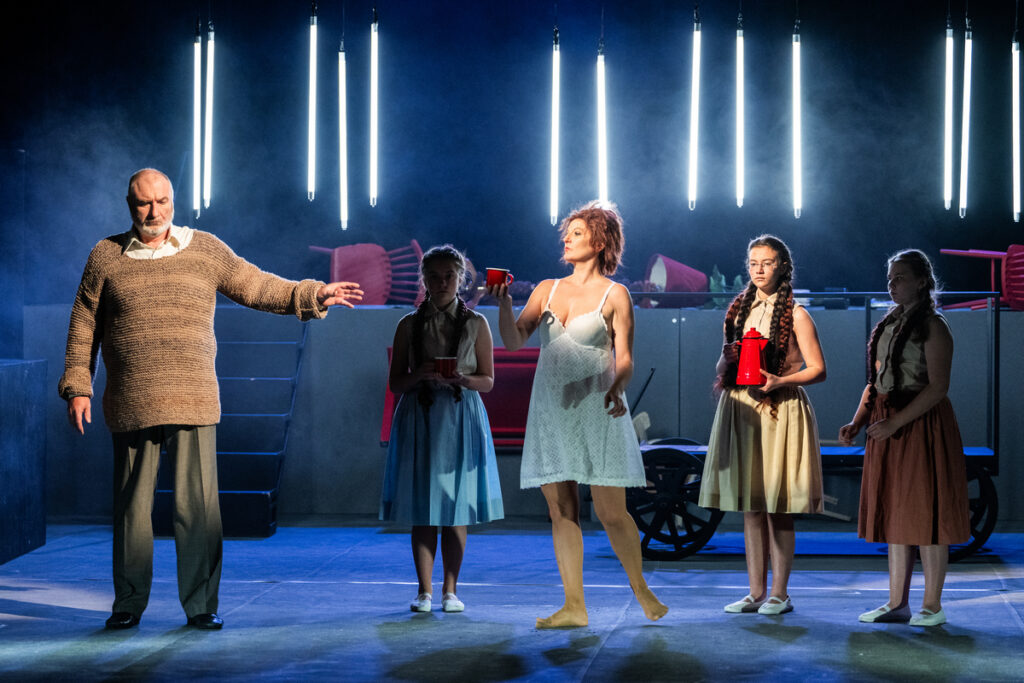 Není to však to jediné, co je v inscenaci v rozporu s činoherní předlohou: není vůbec zřejmé, v jaké době a v jakém prostředí se příběh odehrává. Hraje se na prázdné scéně, jediným výrazným prvkem je světelná rampa ze zářivek, které občas velmi nepříjemně oslňují diváky (scéna a kostýmy Marie Blažková). Rozhodně to není moravská vesnice konce 19. století (kostým a úprava vlasů Lízalky byly obzvláště nevydařené…). Inscenátoři se zřejmě chtěli přihlásit k v současnosti aktuálnímu hnutí boje proti domácímu násilí. Jakási obtížně čitelná aktualizace je však naprosto zbytečná a působí násilně. Stejně tak prvoplánové cedule s nápisem NA PRODEJ, kterými se ženy samy inzerují. Hezkou a srozumitelnou divadelní metaforou byly naopak dlouhé vlasy žen.