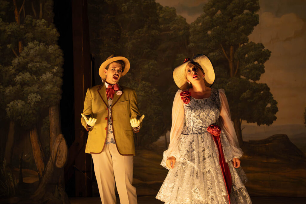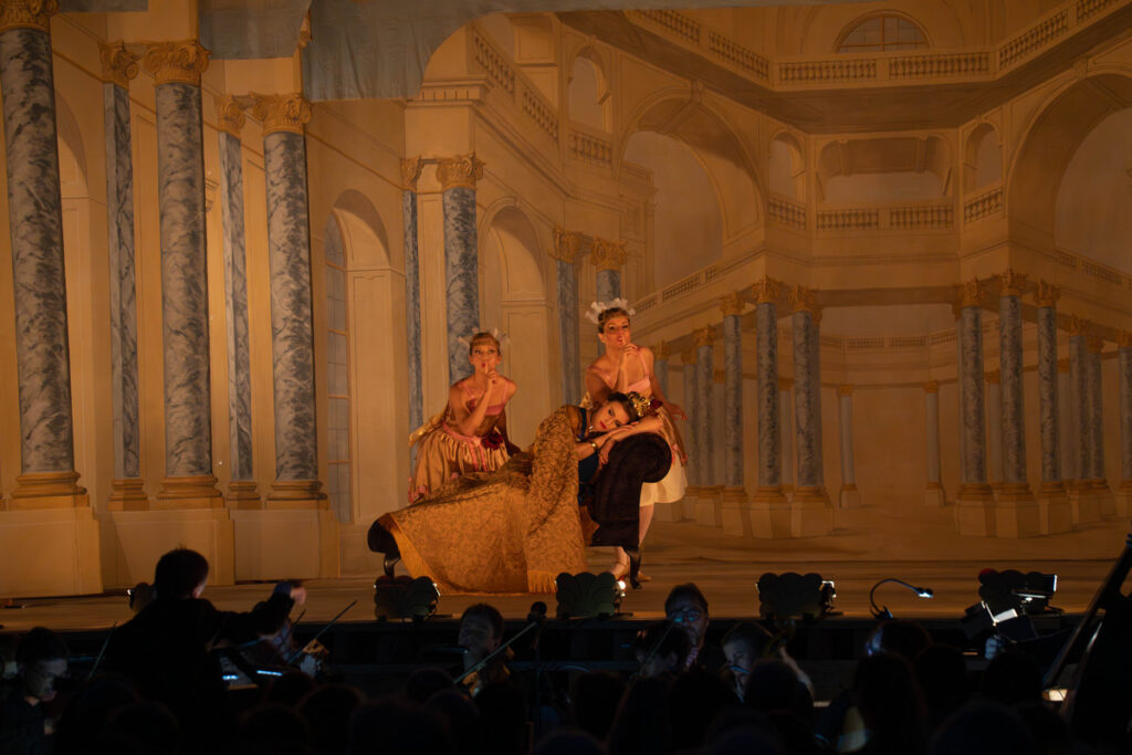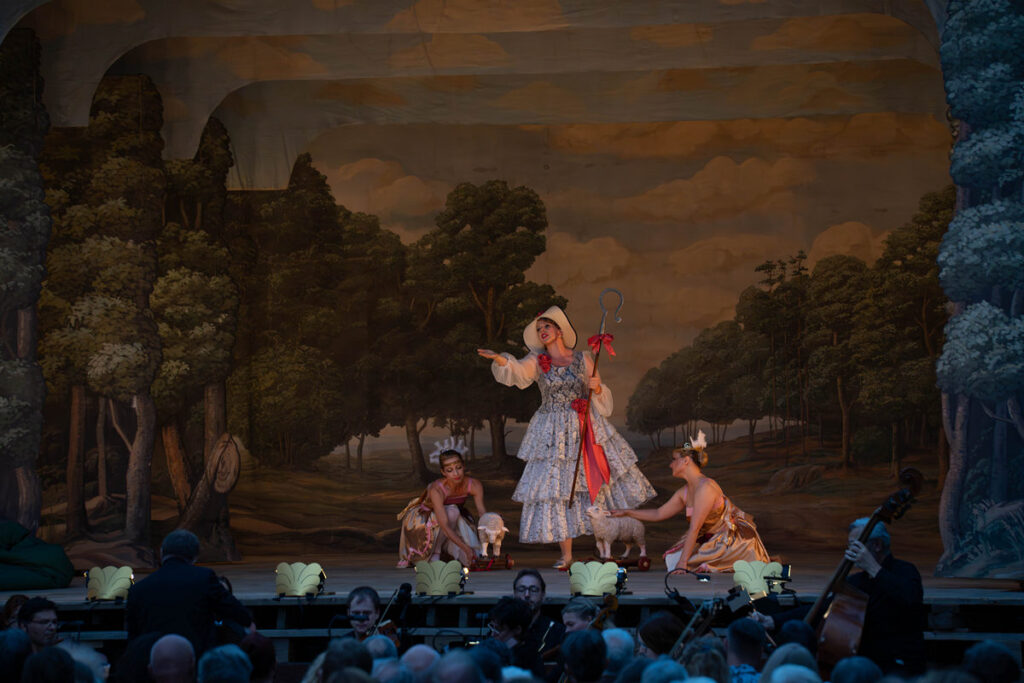 Režie se své obecné spíše náznakovosti ukázala být také funkční, byť někteří ze sólistů se s typickou barokní gestikou vyrovnávali s jistými obtížemi. Ne příliš konkrétní, nýbrž žádoucímu způsobem vláčná gesta podávaná v souladu se zpívaným textem nabídly moc pěkně právě dvě hlavní postavy Pavly Radostové a Vojtěcha Pelky; některé hříčky typu chytání motýla či korzování s bečícími ovečkami na kolečkách přispěly k záživnosti. Celkově jsem přemýšlel, zda by snad nebylo žádoucí jednotlivá dosti kompaktní čísla režijně trochu více „prokomponovat“ či alespoň těsněji napojit, aby inscenace neztrácela tah a nevznikaly menší „palmy“. Že si muzikanti někdy musí otočit stránku, chápu…