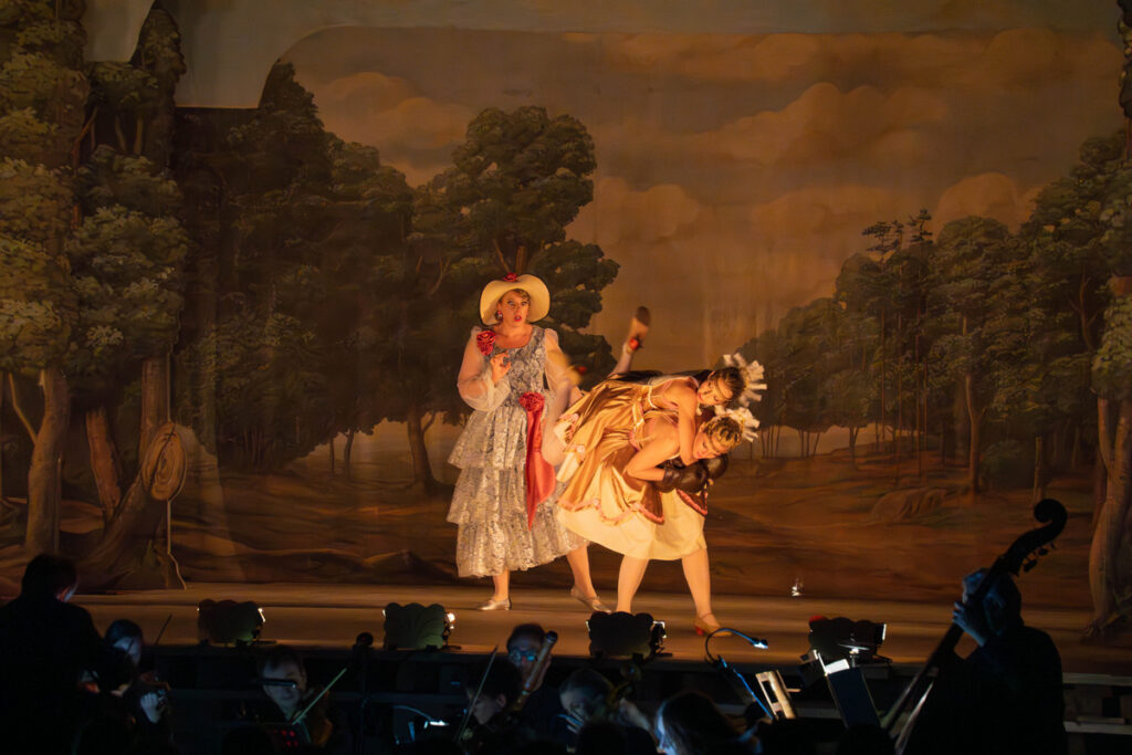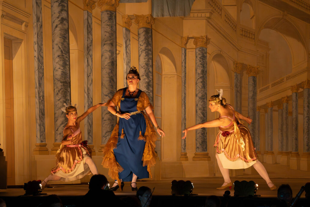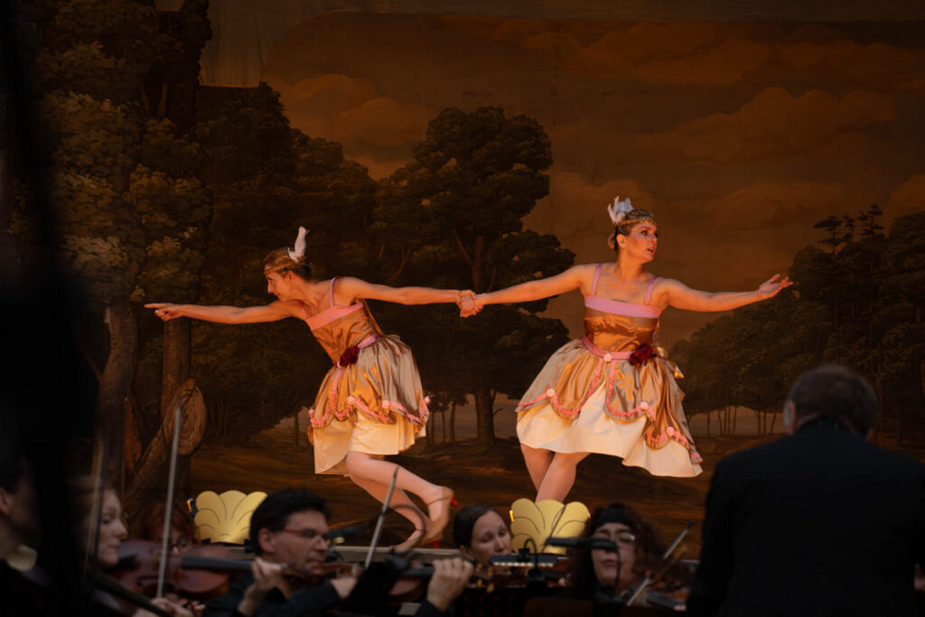 „Pokud jde o tanec, do opery Camilla byly původně vkládány taneční vložky mezi dějstvími, kde sloužily jako ‚divertissement‘, pro rozptýlení, a neposouvaly nijak samotný děj. Nechtěla jsem inscenaci tímto způsobem prodlužovat, a rozhodla jsem se místo toho vytvořit dvě taneční role: ‚putti‘. Doprovázejí děj na určitých místech, naznačují celkovou náladu scény a vnášejí pohyb do situací, které mohou jinak působit staticky kvůli barokní divadelní konvenci, v níž se zpěvák během svého pěveckého výstupu nemá po jevišti pohybovat,“ píše v oficiálním materiálu režisérka a choreografka britského původu Andrea Miltnerová. Nápad dvou tanečních rolí „putti“ (z italského „putto“ – děťátko), které dokreslují dění na scéně, považuju za skvělý. Zmíněný záměr naplnily dokonale, a dokonce sklidily první potlesk na otevřené scéně za svůj vysloveně boxerský zápas (ano, měly dokonce rukavice), který mi ale připadal už trochu mimo zvolenou stylovost. Každopádně se jím však velice efektivně zvedla stavidla divácké přízně, takže následně přicházel potlesk téměř po každém čísle. Tančily Romana Konrádová a Lucie Holánková.