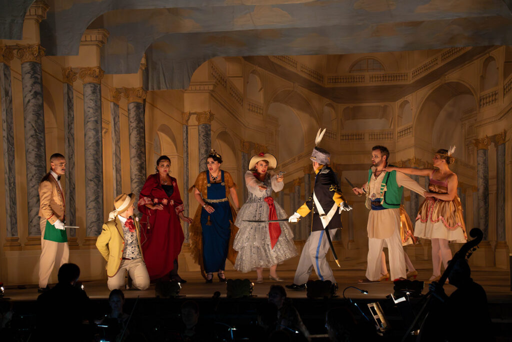 Orchestr hrál výborně. Nestandardní úlohy hraní open air se zhostil nebojácně a suverénně, umělecký vedoucí Marek Štryncl většinu večera inspirovaně řídil od své barokní kytary. Registroval jsem snahu méně průrazným hlasům ustupovat, čitelná byla také hra v co nejširším dynamickém i výrazovém spektru. Ansámbl spolu pěkně dýchal.