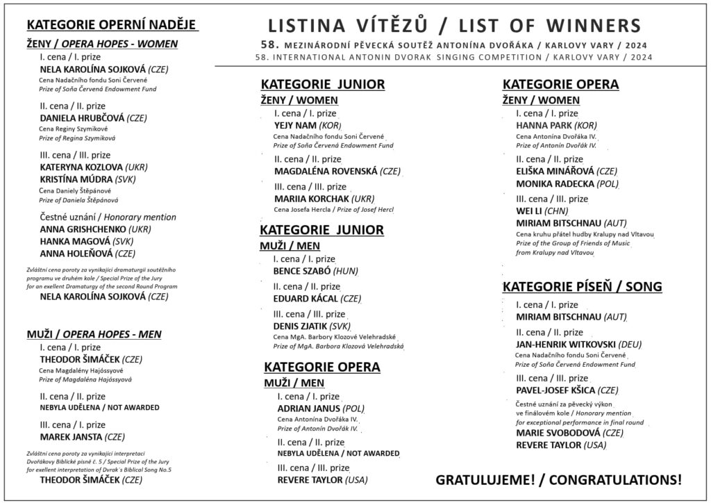 První skončil v kategorii Junior Bence Szabó, Maďar s velmi dobrou češtinou. Vybral si árii Purkrabího z Dvořákova Jakobína; jeho hlas je jakoby méně kultivovaný a nemůže navíc vyjádřit tolik chvástavé výsměšnosti a výhružnosti, jak to bývá přítomno v podání tuzemských buffo basů. Jeho vystoupení, určitě díky výběru českého titulu i pro srozumitelný přednes, mělo nicméně u publika velký ohlas. Korejka Yeji Nam, také nositelka juniorské první ceny, se pustila do árie Barče ze Smetanovy Hubičky: pěkný zdravý hlas s krásným rozsahem, ale čeština nebyla zdaleka dobrá…
