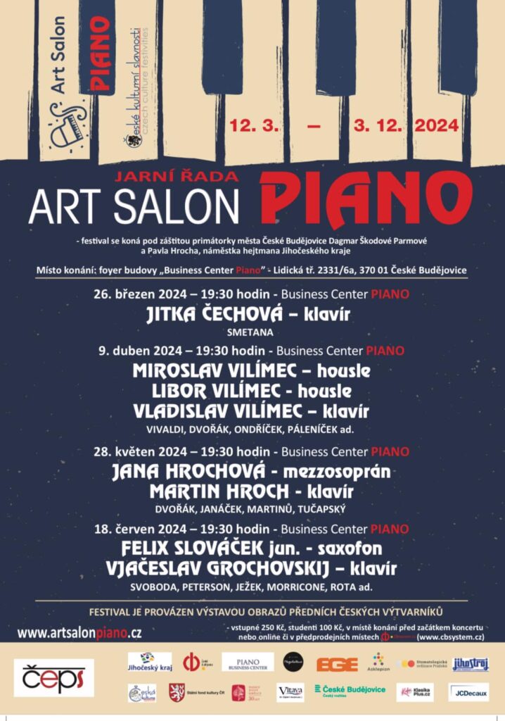 Multikulturní mezinárodní festival Art salon Piano, který pořádá spolek Česká kultura v prostorách foyer budovy s názvem Business Center Piano v Českých Budějovicích, nabídne i v letošním roce řadu hudebních setkání spojených s mluveným slovem, výtvarným uměním a debatami s interprety. Koncertní řadu zahájí dnes 26. března klavíristka Jitka Čechová s programem věnovaným dvoustému výročí narození Bedřicha Smetany. V úterý 9. dubna Art salon Piano přivítá trio Vilímců, houslisty Miroslava a Libora a klavíristu Vladislava, kteří návštěvníkům zahrají skladby Vivaldiho, Tartiniho, Dvořáka, Ondříčka, Páleníčka a Šostakoviče. Květnový program nabídne vystoupení manželského dua mezzosopranistky Jany Hrochové s klavíristou Martinem Hrochem, kteří provedou skladby Martinů, Dvořáka a Janáčka. Jarní řadu v červnu završí populárněji laděný koncert saxofonisty, klarinetisty a zpěváka Felixe Slováčka mladšího s klavíristou Vjačelsavem Grochovským. Podzimní čtveřici koncertů otevře 10. září vystoupení Smetanova tria s programem složeným z české hudby, děl Suka, Dvořáka a Smetany. V říjnu klavírní salón bude hostit italské klavírní duo Michelle Campanelly a Minicy Leone, kteří zahrají skladby Mozarta, Schuberta a Dvořáka. V listopadu do Českých Budějovic zavítá Duo L’alba klarinetistky Anny Paulové a kytaristy Lukáše Sommera a v úterý 10. prosince se Art salon Piano uzavře za zvuků „šlágrů z celého světa“, jak hlásá název koncertu, které uvede Vedvouband Kateřiny Bodlákové a Henryho Volfa.