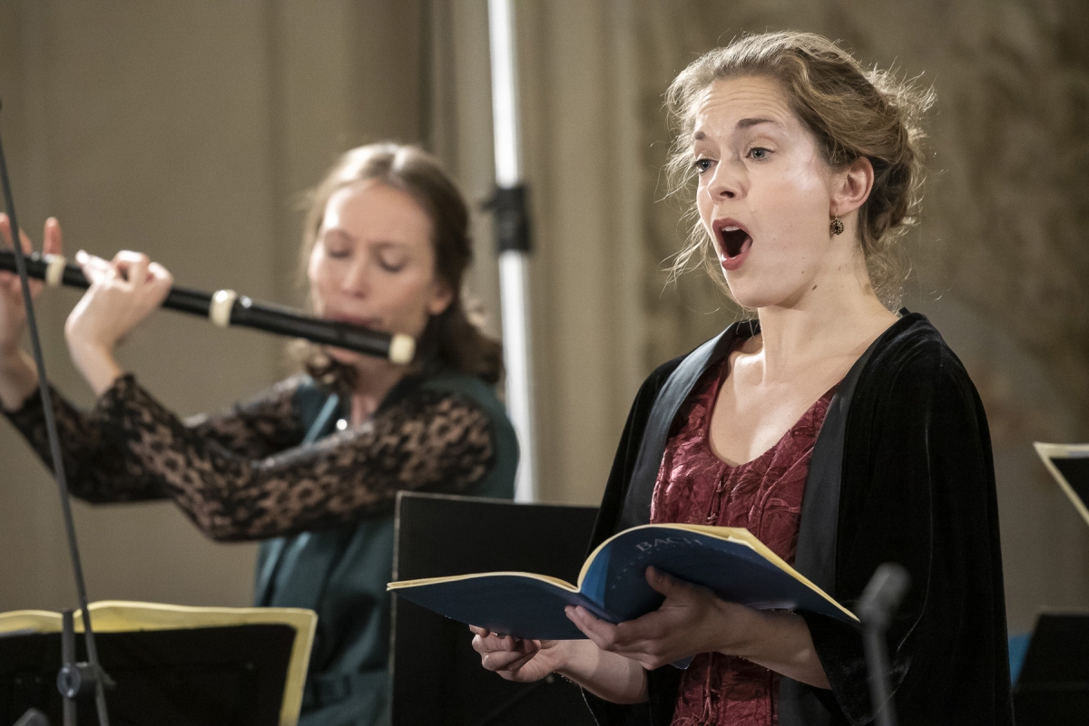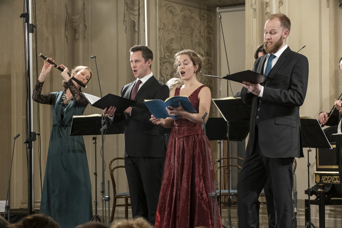 Ústředním bodem a také vrcholem programu nesporně měla být a také byla Kantáta o kávě „Schweigt stille, plaudert nicht“, oblíbená a zábavná Kaffee-Kantate od Johanna Sebastiana Bacha. Skoro malý operní výstup. Byla tak i uvedena – s nástupem sólistů na jeviště dějově cítěným už od dveří. Slečnu, která zcela propadla vůni a chuti kávy, zazpívala a zahrála neodolatelně sopranistka Lore Binon. V roli rozmarné Lízičky se cítila doma vokálně i herecky s naprostou samozřejmostí. Její dialog s flétnou byl v hlavní sopránové árii dokonalý. Jako nešťastný otec, snažící se nezdárnou dceru od pití kávy odvést, jí výborně sekundoval Tomáš Král. Šlo prý o záskok, zvládnutý ale excelentně. Mladý barytonista vládne pěkně posazeným a pohyblivým hlasem, měkkým témbrem. Zejména ve staré hudbě ho rádi slyšíme kdykoli. Nenápadný, ale stylově přesný byl i tenorista lahodného hlasu Tomáš Lajtkep.