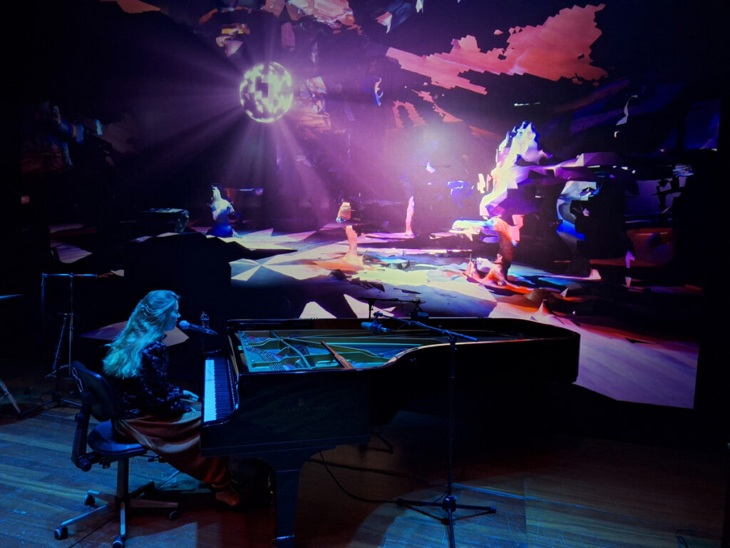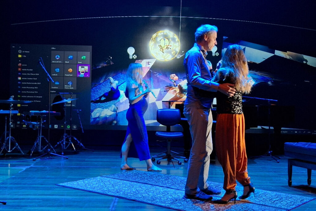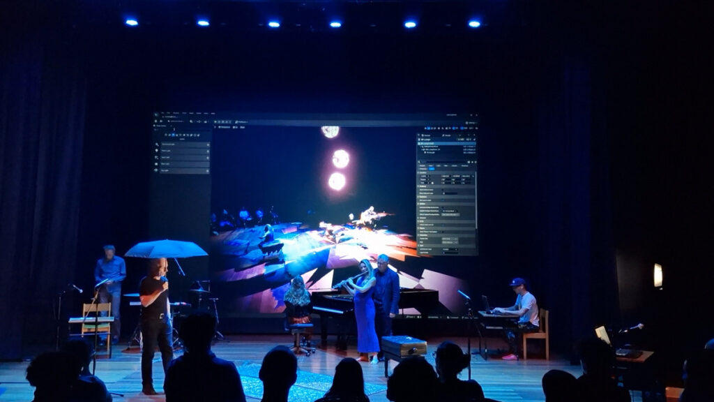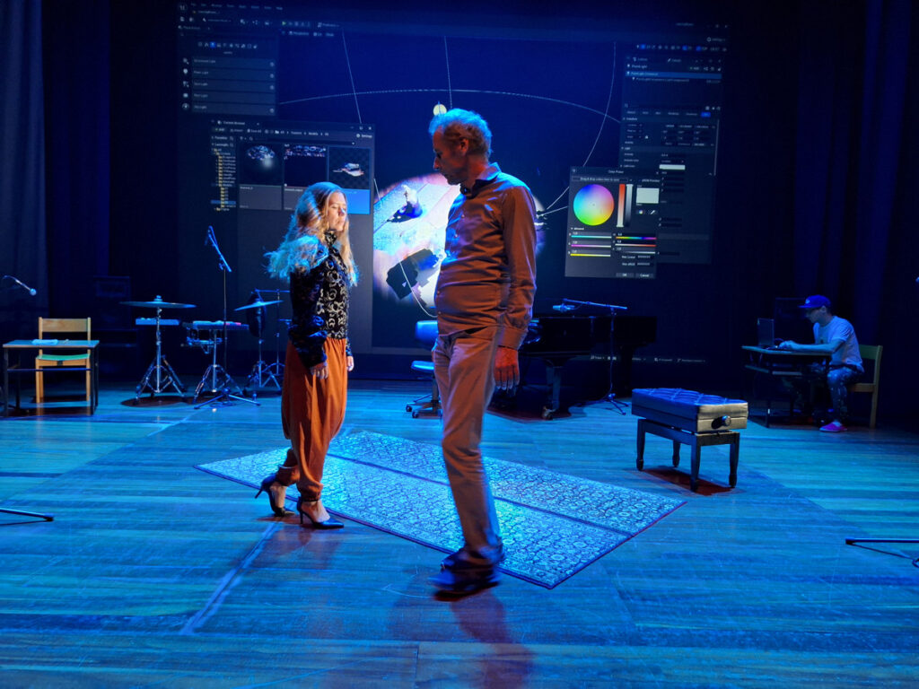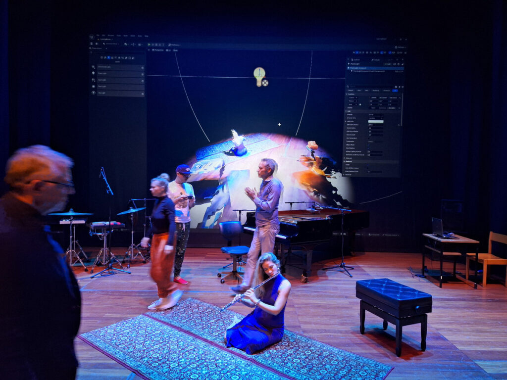 Za nimi je umístěno v šikmé diagonále křídlo s množstvím mikrofonů, jeden vpředu, jeden na straně zezadu mírně nahoře a jeden uvnitř. Kolem tohoto centrálního bodu jsou umístěny tři stoly s notebooky, u každého z nich mikrofon. Dohromady vytváří téměř trojúhelník. Žlutá světla pomalu začínají slábnout, proměňují se v modravý opar, což znamená, že představení právě začíná. Elektronika rámuje počátek a konec představení a různé prvky se vždy objevují dvakrát, což vytváří dojem kruhovitosti a v závěru pocit, že jsme dospěli na stejné místo jako na začátku.