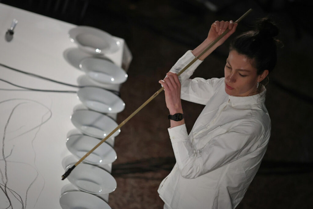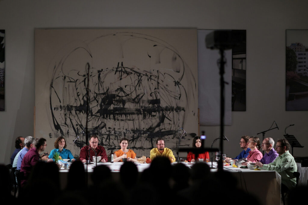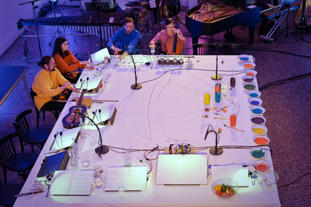 Performance o pěti částech začala příchodem malířky Charlotte Guibé k bíle prostřeným stolům, které se tímto okamžikem staly hudebním nástrojem i rekvizitou, později zastaly také roli malířského plátna. Nebyly však jedinou plochou, na kterou se ten večer malovalo. Další velké bílé plátno se nacházelo za stoly a zachytávalo nejen barvy nanášené štětci, ale také promítaná videa. Od začátku až do konce představení byl každý zvuk, vizuální vjem, text i pohyb součástí husté sítě vztahů, která však byla před posluchači-diváky splétána s lehkostí. Linie kontrapunktu tvořily zvukové struktury vycházející z kuchyňského nádobí, netradičních i tradičních nástrojů (s využitím rozšířených technik, ale třeba i názvuků jazzu), pohyby malířky mezi stolem s barvami, jídelním stolem a plátnem, přesuny hudebníků mezi stoly a pulty stojícími opodál, tahy štětců, promítané obrazy, světelné efekty, recitace textu… Z malby a pohybů se dokonce místy stávala živá grafická partitura, na kterou reagovali hudebníci. Čeho jsme byli svědky? Provedené skladby? Odehraného divadla? Vytvoření obrazu na zdi a na stole? Rozhodně uskutečnění mnohovrstevnatého díla.