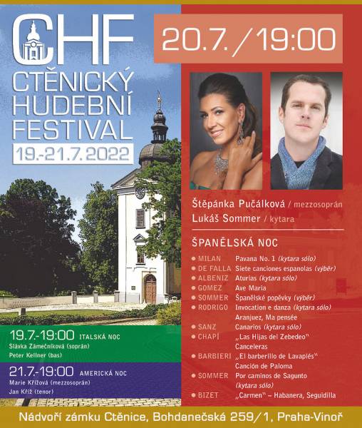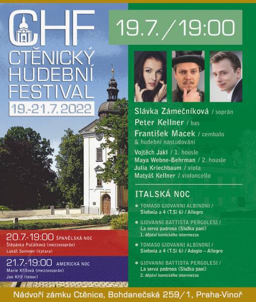 V úterý začíná Ctěnický hudební festival. Koná se podruhé, opět v Zámeckém areálu Ctěnice, který leží na pomezí pražských městských částí Vinoř, Kbely, Čakovice a středočeské obce Přezletice. Ve dnech 19. až 21. července na něm postupně vystoupí sopranistka Slávka Zámečníková a basista Peter Kellner, mezzosopranistka Štěpánka Pučálková a skladatel a kytarista Lukáš Sommer a muzikálový zpěvák Jan Kříž si spolu s manželkou Marií. Program bude ušitý na míru festivalu a každý večer přinese jiný žánr. Začíná Pergolesiho komedií Služka paní.