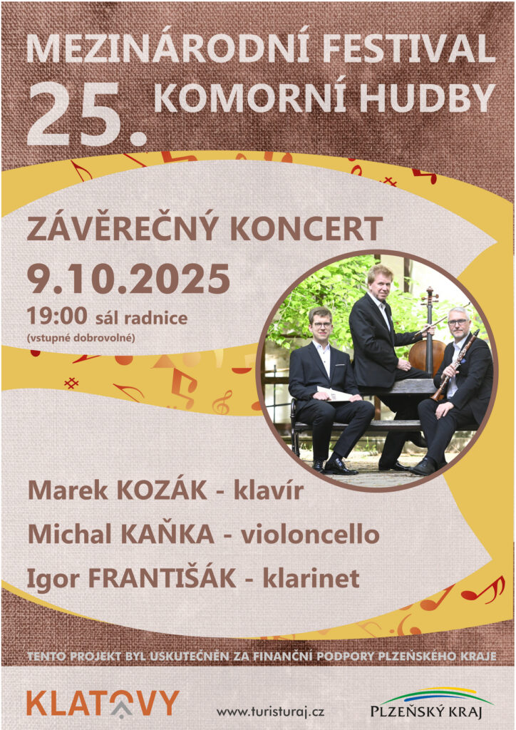 Už od roku 2000 se Klatovy v době letní sezóny stávají centrem komorní hudby. Mezinárodní festival komorní hudby, který tradičně oslovuje domácí i zahraniční interprety se přiblížil ke svému zakončení. Jeho letošními posledními hudebními hosty budou tři výrazné osobnosti české hudební scény: letošní čerstvý držitel Ceny Jiřího Bělohlávka a úspěšný laureát Bachovské soutěže v Lipsku, klavírista Marek Kozák, sólový violoncellista, člen letos čtyřicetiletého Wihanova kvarteta a také osobnost Mezinárodní interpretační soutěže Pražské jaro Michal Kaňka a do třetice klarinetista, ale také ředitel Svatováclavského hudebního festivalu a festivalu Hudební výlety Igor Františák. Triový program v podání uvedených interpretů završí pětadvacátý ročník klatovského festivalu druhý říjnový čtvrtek v sále místní radnice.