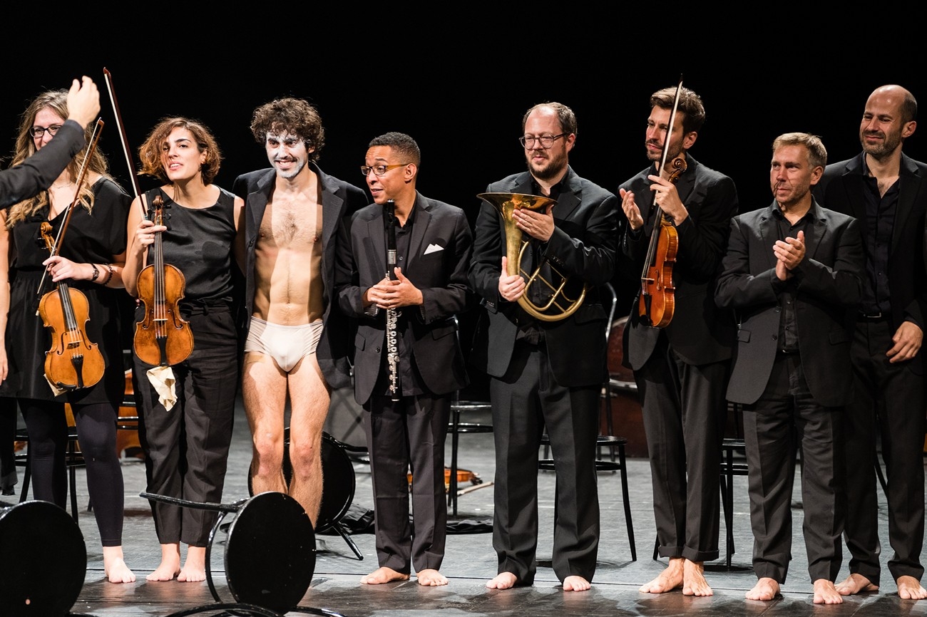 Po čtvrté části L’entrée des Scaramouches, Trivelins et Arlequins se scéna změnila. Hlavnímu tanečníku Jourdainovi se podařilo dostat mezi aristokratickou smetánku, což bylo vyjádřeno krásnou Chaconnou, při které se postupně vzájemně uklonil s každým členem orchestru. Ten při své úkloně připojil i instrumentální sólo a tím Jourdaina symbolicky uctil ještě více. V dalších částech jsme se ocitli na bále. Různé tance francouzské suity byly vyjádřeny pokaždé jinou choreografií, více či méně organizovaným a uspořádaným tancem orchestru. Velmi krásný byl tanec hlavní dvojice večera – Martí Corbery a dirigenta Davida Greilsammera na pomalý air při hře světla a stínu v malém čtverci na pozadí pódia.