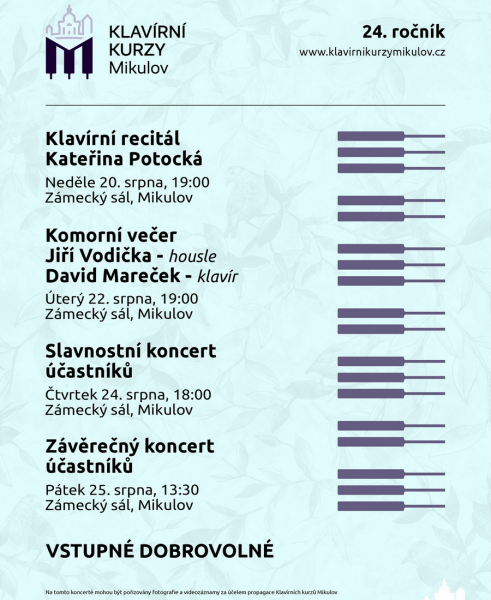 Klavírní kurzy každoročně oslovují široké spektrum klavíristů. Mezi ně patří především žáci základních uměleckých škol, kteří se věnují tomuto nástroji čistě z amatérského nadšení, ale i ti vážně přemýšlející o své budoucí profesionální pianistické kariéře. Doplňují je studenti, kteří se již pro tuto uměleckou dráhu rozhodli a v současné době jsou posluchači konzervatoře nebo akademie múzických umění. Do Mikulova se sjíždějí i samotní pedagogové klavírní hry, kteří si zde jako pasivní účastníci rozšiřují prostřednictvím nabízeného programu odborné znalosti a rozhled. Reportáž z minulého ročníku je k přečtení ZDE.