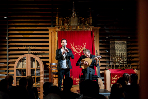 Fakt, že se koncert odehrával v synagoze, přece jenom ale nezůstal ze strany interpretů zcela bez odezvy, a tak se David Orlowsky na přechodu prvé a druhé (autor John Dowland) skladby dopustil jemného klezmerového předělu. Skladby v úvodu koncertu byly bez předělů a pauz; zazněly jako jedno pásmo, ve kterém oba citlivě hrající muzikanti přecházeli ladně mezi renesančními a barokními skladbami a vlastními kusy.