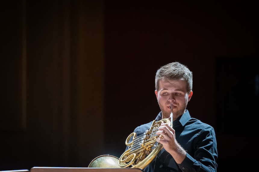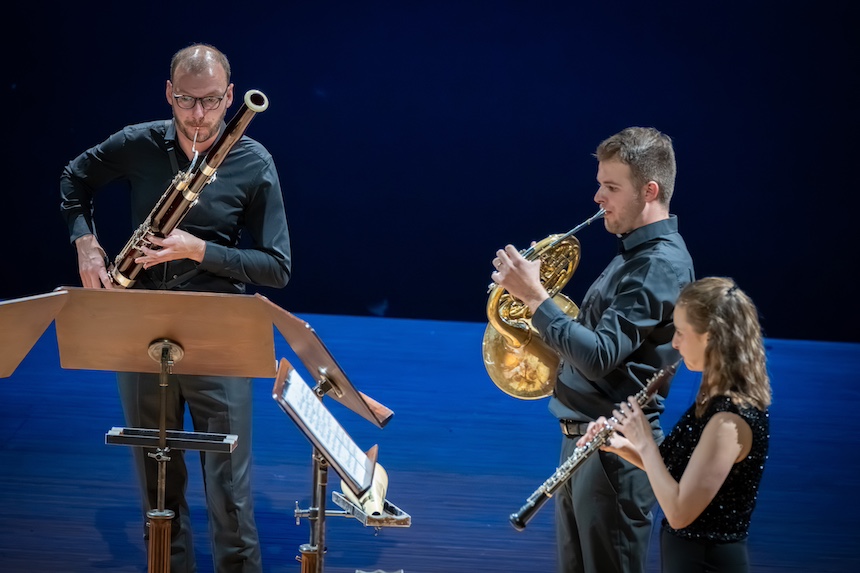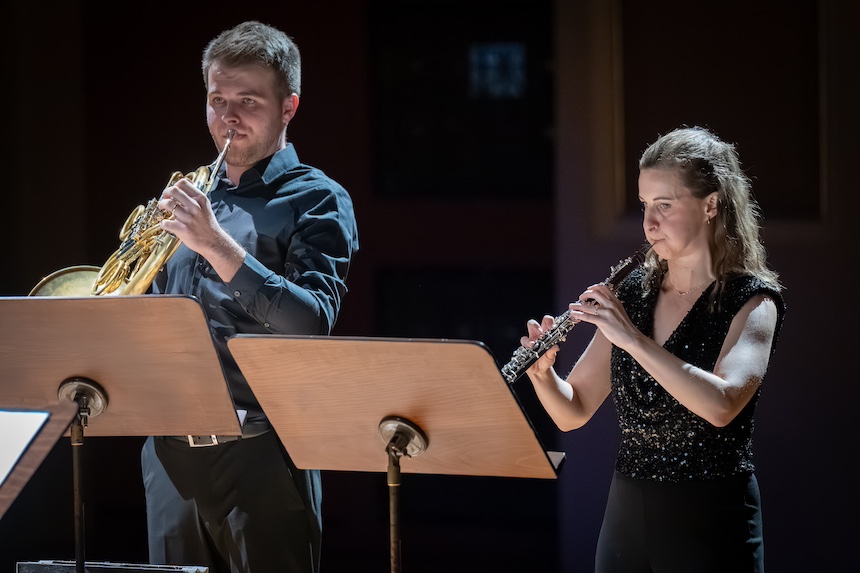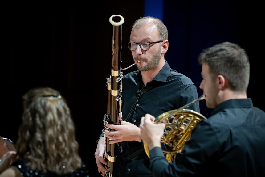 Začalo se předehrou k Verdiho opeře Síla osudu v úpravě Joachima Linckelmanna, což je německý flétnista narozený v roce 1964, který údajně upravuje pro komorní obsazení i závažná duchovní díla jako Dvořákovo Stabat Mater. Tato verze samozřejmě není tak osudová ani tak naléhavá – ale je to samozřejmě krásný koncertantní kus. Je zajímavé, jak si s protihlasem houslí poradí flétna a jak si hlavní réma předává klarinet s lesním rohem. Jen člověk nesmí mít příliš v uších původní orchestrální verzi. Flétnistka Anna Talácková pak koncert uvedla a připomněla koncert, kdy tuto předehru hrála pro televizi Česká studentská filharmonie se Semjonem Byčkovem v čase lockdownu. Musel to být velmi sbližující zážitek pro všechny. Nikdy mě nenapadlo v této předehře sledovat lesní roh, zde Kryštof Koska, nebo klarinet Davida Šimečka a fagot Petra Sedláka.