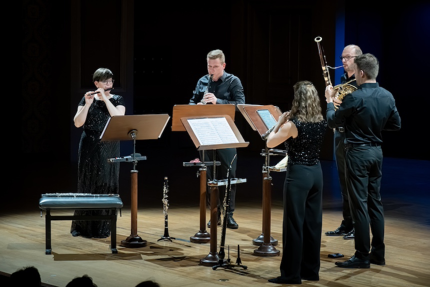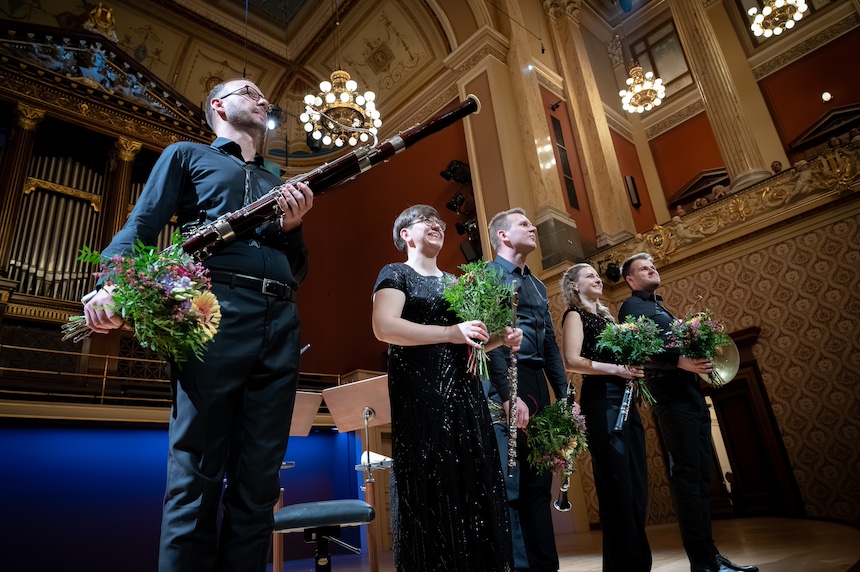 Sympatický soubor Alinde Quintet, který vloni vystoupil na Pražském jaru i leckde jinde, vyhrál stejnou soutěž, jakou v 90. letech vyhrál jen Afflatus Quintet, slavný soubor ve stejném nástrojovém složení. Zhruba před deseti lety se etabloval Belfiato Quintet, takže máme dnes vlastně tři soubory v atraktivním dechovém složení, které mají světovou kvalitu. Jediná překážka a zároveň výzva je repertoár, protože nemohou a nechtějí všichni hrát odlehčený klasicismus a velebit jen Antonína Rejchu. Alinde Quintet si v tom počíná znamenitě, když jsem jej slyšel naposledy letos v květnu v sezóně Prague Philharmonia, vytáhl tři neznámé skladatele a hudba to byla výtečná. Tentokrát to bylo jinak, skladatelé byli slavní, ale tři ze čtyř skladeb programu nebyly původně pro toto obsazení, šlo o dovedné úpravy.