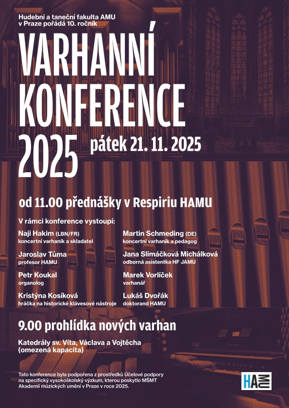 Druhý blok konference bude pokračovat příspěvky pozvaných lektorů od jedenácti hodin v Respiriu na půdě Akademie múzických umění v Praze. V úvodu tohoto bloku jubilejního 10. ročníku konference promluví zakladatel Varhanní konference Pavel Svoboda, pedagog HAMU a ředitel Komorní filharmonie Pardubice. Dále se lze těšit na mnohé příspěvky z oboru organologie, varhanářství nebo varhanní tvorby. „Moc nás těší, že pozvání přijal významný koncertní varhaník, improvizátor a skladatel libanonského původu Naji Hakim, který bude přednášet o jeho kompozičním přístupu a inspiraci, či profesor varhanní hry Martin Schmeding z prestižní německé univerzity Hochschule für Musik und Theater ‚Felix Mendelssohn-Bartholdy‘ Leipzig, který bude rozebírat vlivy na mladého skladatele a hudebníka J. S. Bacha,“ za organizátory uvádí varhaník Juraj Křemen. Klíčovým momentem letošní konference bude vystoupení profesora Jaroslava Tůmy, který představí konkrétní projekty trojích nových varhan pro Akademii múzických umění v Praze, o nichž KlasikaPlus.cz informovala ZDE.