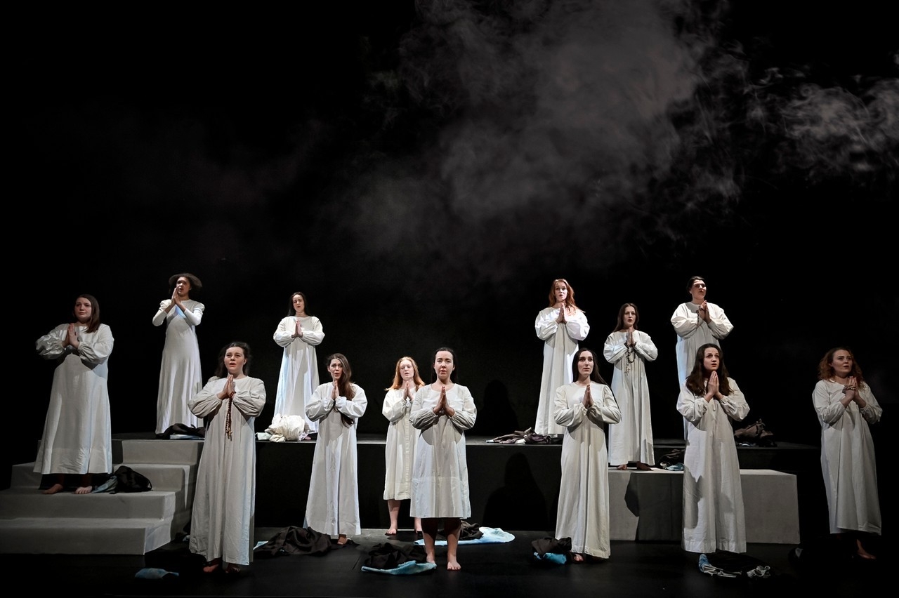 Výtvarnicí scény je Tereza Jančová, kostýmy jsou prací Julie Emy Růžičkové, studentky ateliéru scénografie DIFA. Jednoduchost scény je umocněna bílými oponami na horizontu, které se překrývají a jen jejich pohyby vnášejí do představení dynamiku. Dívky jsou v jednoduchých řeholních hábitech, po jejich odložení jen v bílých řízách. Ostatní účinkující se připodobňují dobovému oblečení, které v kontrastu s něžnou bělostí dívek působí hrubě. Ale i to je v pořádku, lůza byla hrubá.