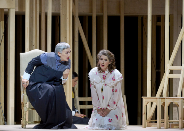 Představení začíná v tichu, postavy na scéně se pohybují, ale vše je bez hudby. Najednou dívka vykřikne a vpadá předehra. Pojetí je velmi realistické, emoce, které tryskají z jednání jednotlivých postav, jsou bezprostřední a pravdivé. Scéna umírání staré převorky je expresivně vypjatá, a přestože zřejmě nikdo z diváků neměl možnost vidět takový bolestný a úporný boj se smrtí, byl každý detail hereckého projevu uvěřitelný. Režisérka Magdalena Fuchsberger střídá hereckou úměrnost ve výraze s náhle vypjatými, až křečovitě akcentovanými akcemi, které tím více vyniknou. Kostýmy Valentina Köhlera jsou v historizující stylizaci, hábity karmelitánek jsou černé s barevnými sedly, charakterizujícími jednotlivé postavy. Lidové postavy a vojáci jsou historicky čitelné, i když opět stylizované.