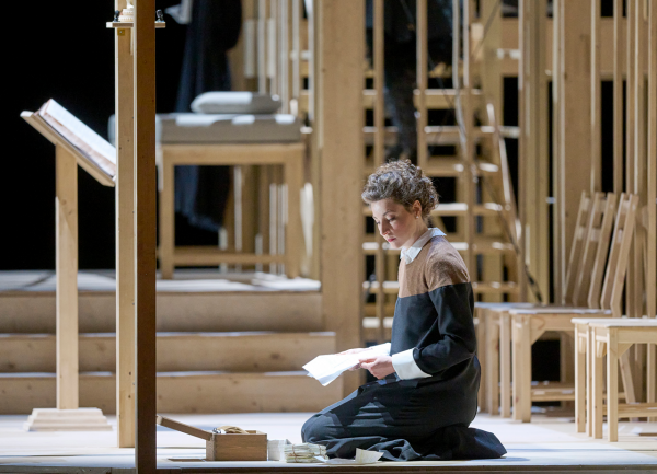 Na scéně Moniky Biegler diváka nejprve zaujme lehká, ale obrovská dřevěná konstrukce kostela a kláštera, která se pohybuje na točně a je přes ni vidět na druhou stranu jeviště. Nejprve působí nepatřičně, jako obrovské lešení. Během večera ale nabývá na funkčnosti, zejména ve scénách přepadení a drancování kláštera, kdy vyvolává i přes málo akcí silný dojem devastace. Vnitřek konstrukce je účelně členěný, takže se jednotlivé obrazy mohou odehrávat v izolovaných částech, přesto je vše stále propojeno.